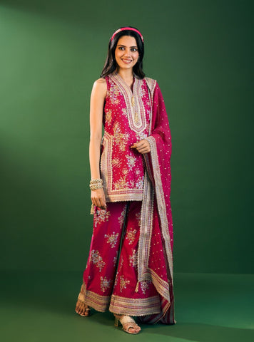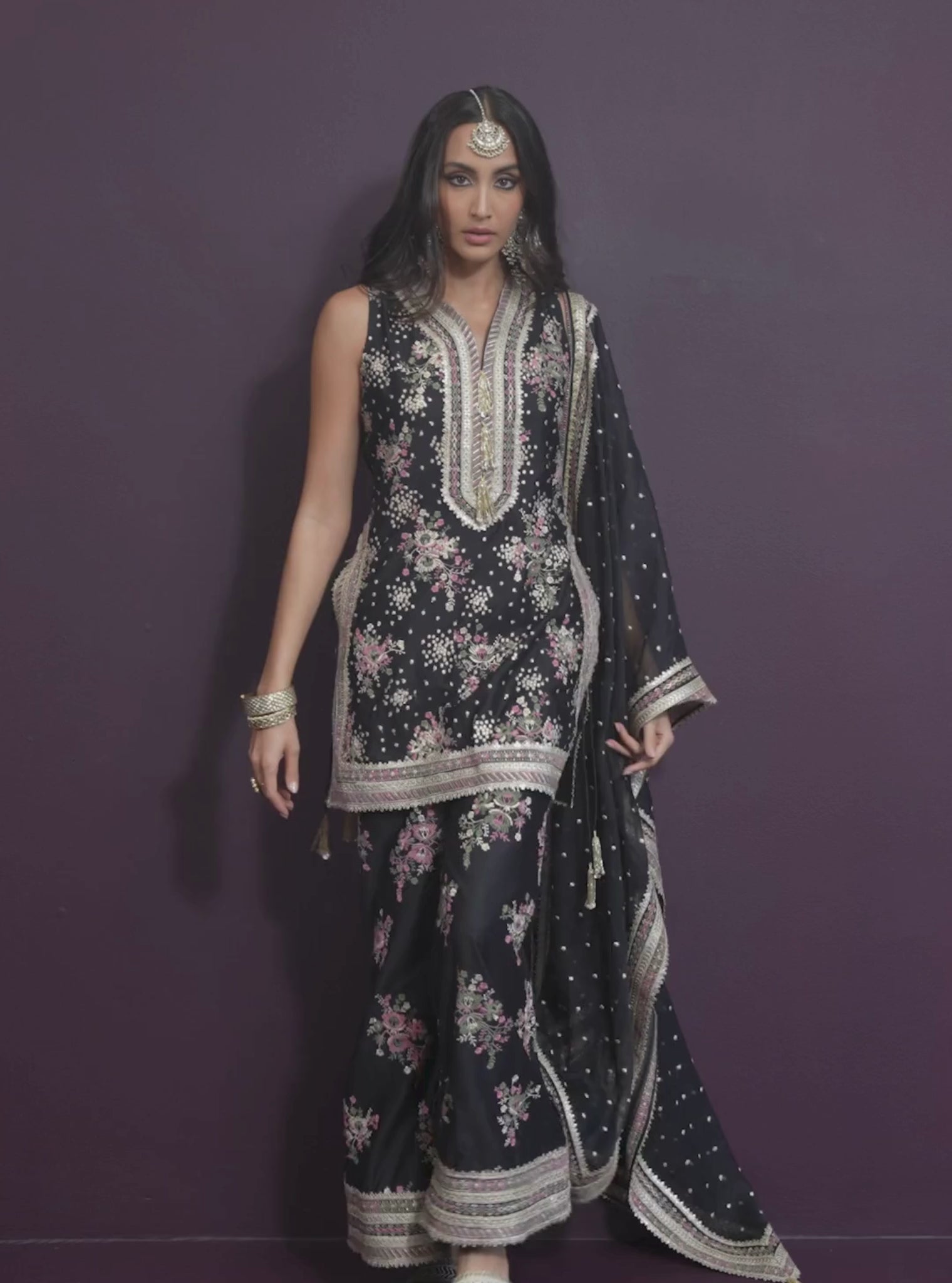 Elegant and striking, this kurta set in pima satin features intricate floral detailing on a rich black base. Styled with flared pants and a matching black organza dupatta, it’s a look that balances tradition with contemporary glamour.