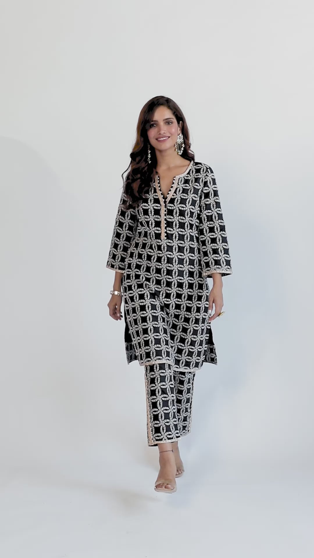 Mulmul Supima Satin Perry Black Kurta With Perry Black Pant