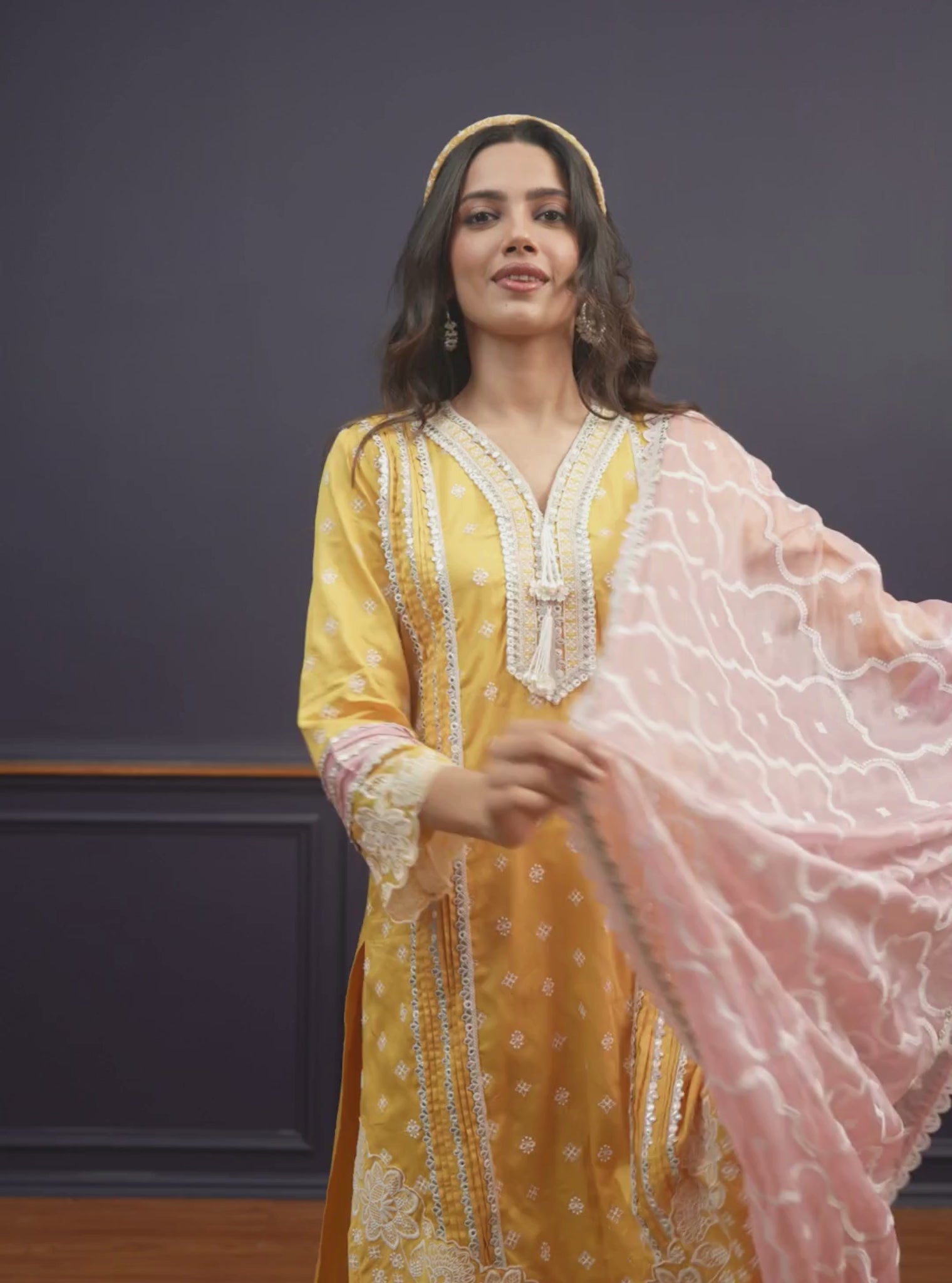The Pira Kurta Set in Mustard radiates warmth and vibrance. Cut from fine Pima Satin, it features intricate lacework and embroidery that lend it a festive charm. Styled with matching pants and a Pink Organza Dupatta detailed with lace borders, this ensemble adds a soft romantic touch to celebratory dressing.