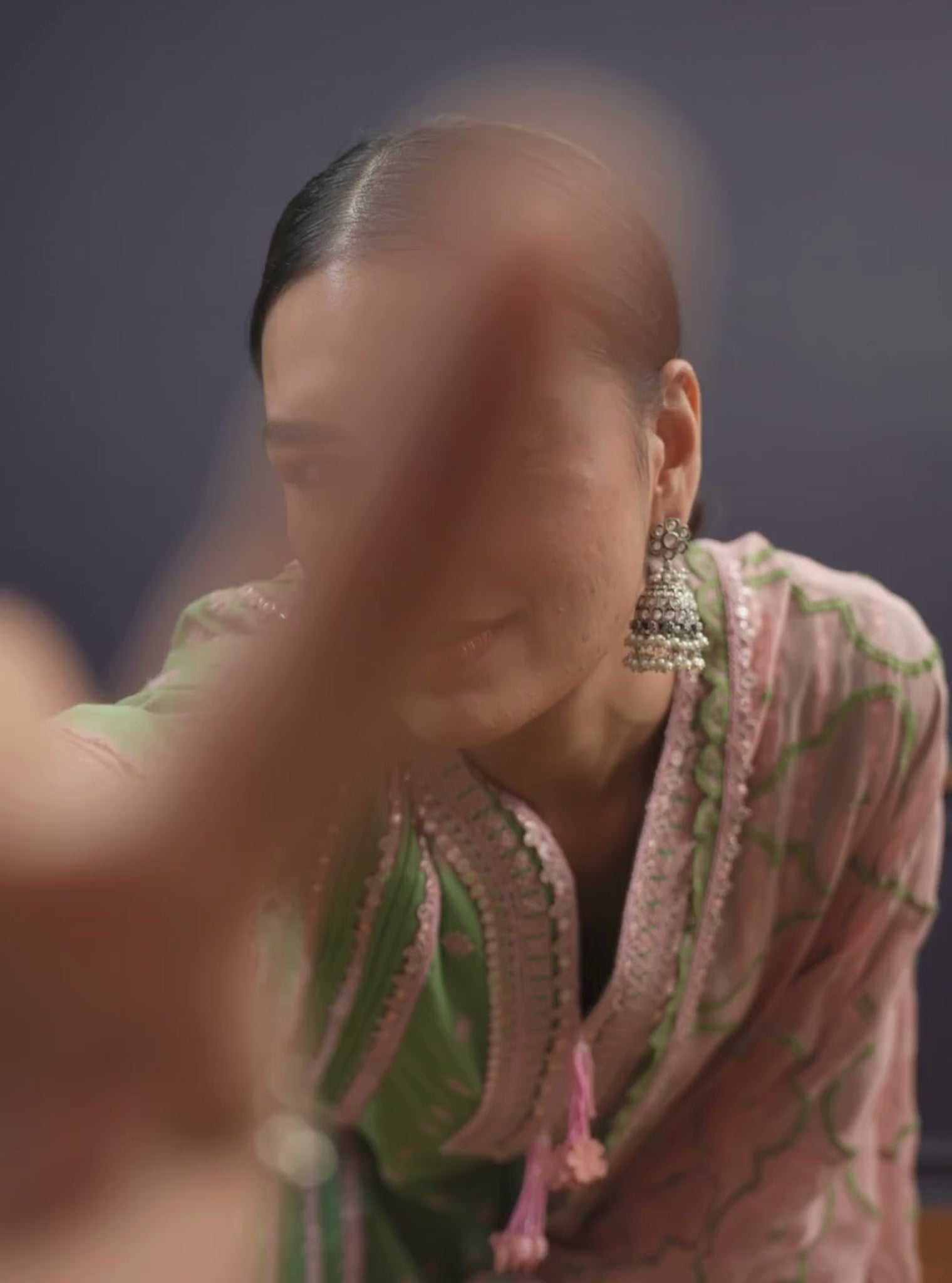 Crafted in smooth Pima Satin, the Pira Kurta Set in Parrot Green brings together heritage detailing and youthful freshness. The kurta’s lace accents and delicate embroidery contrast beautifully with the Pink Organza Dupatta, finished with scalloped borders. Light, breezy, and effortlessly elegant — this set is designed for festive days that flow into long, joy-filled evenings.
