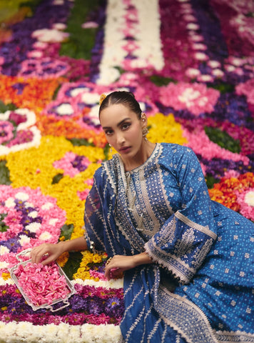 Festive warmth in a mustard printed kurta set crafted from pima satin. The straight kurta and pants are finished with a matching organza dupatta, adding lightness to the rich base.
