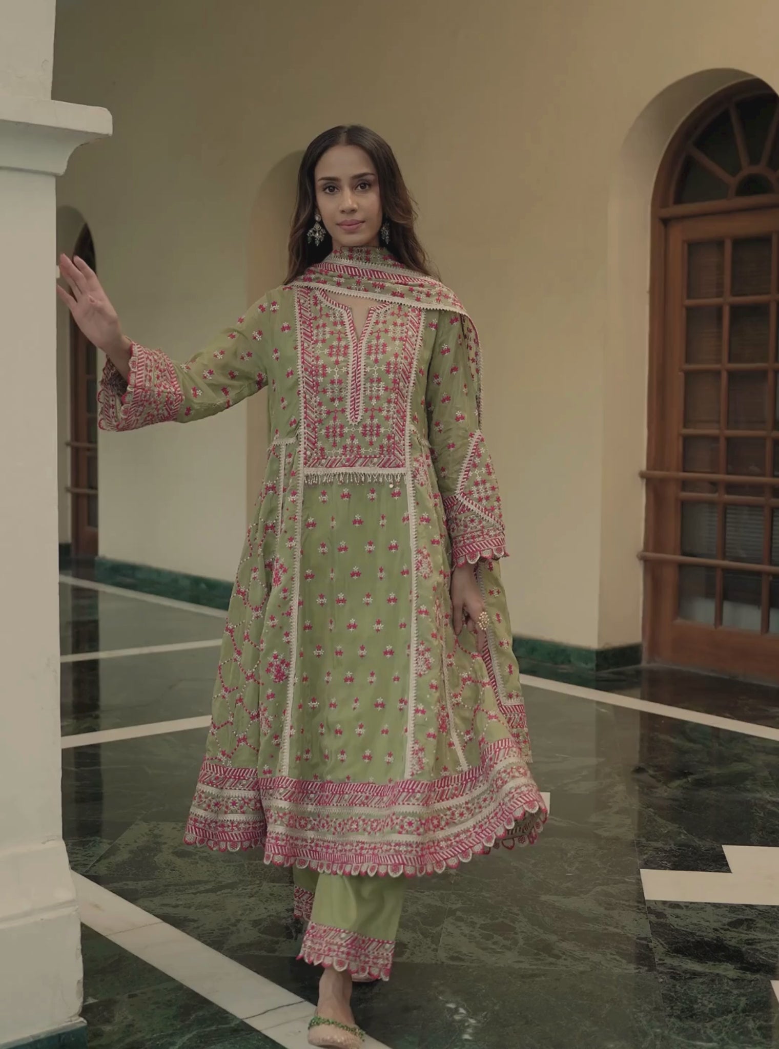 Sundari Viscose Glass Organza Luxe Pista Green Anarkali Kurta Set