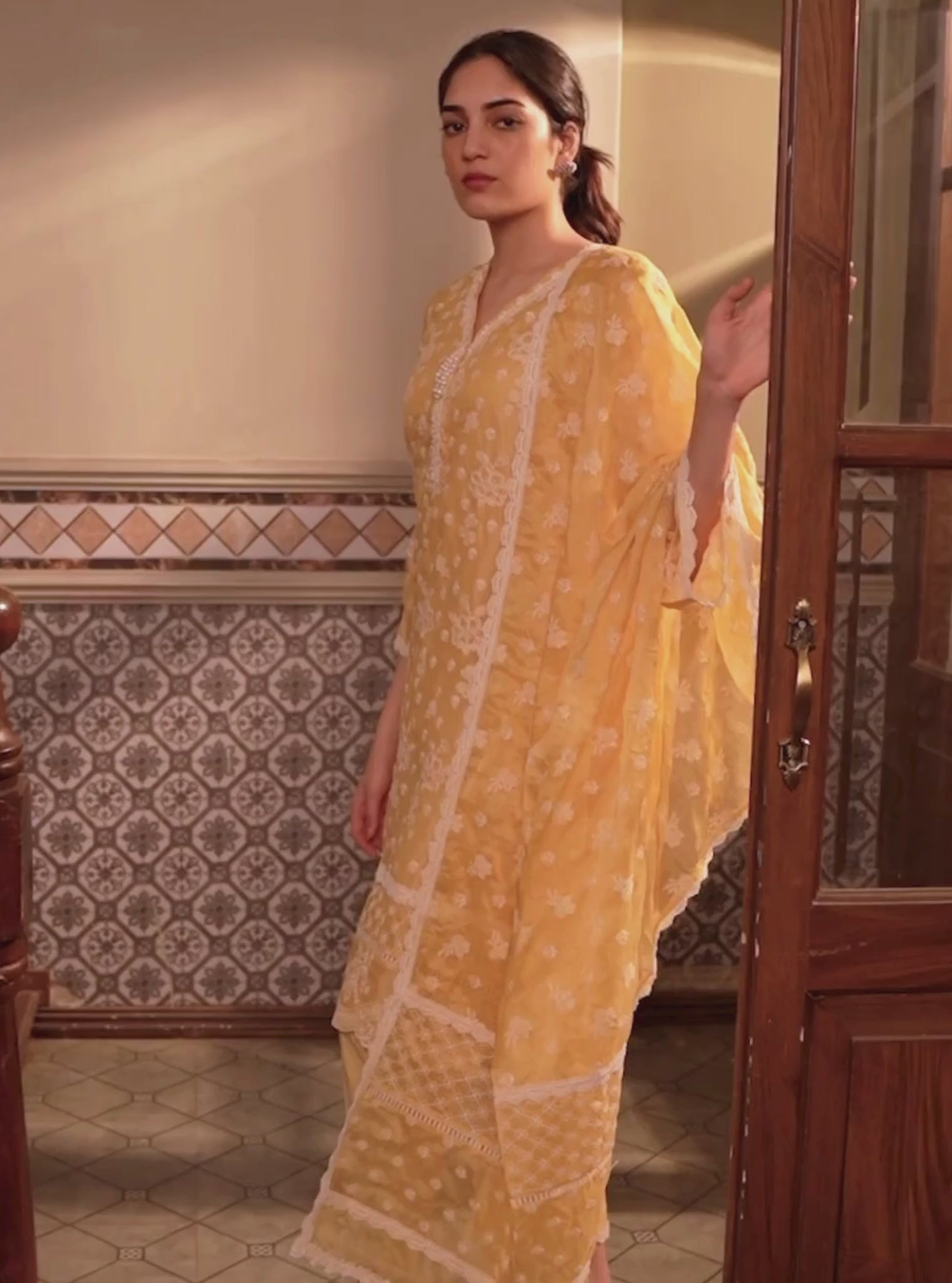 Avathi Pima Satin Yellow Kurta with Garara Set