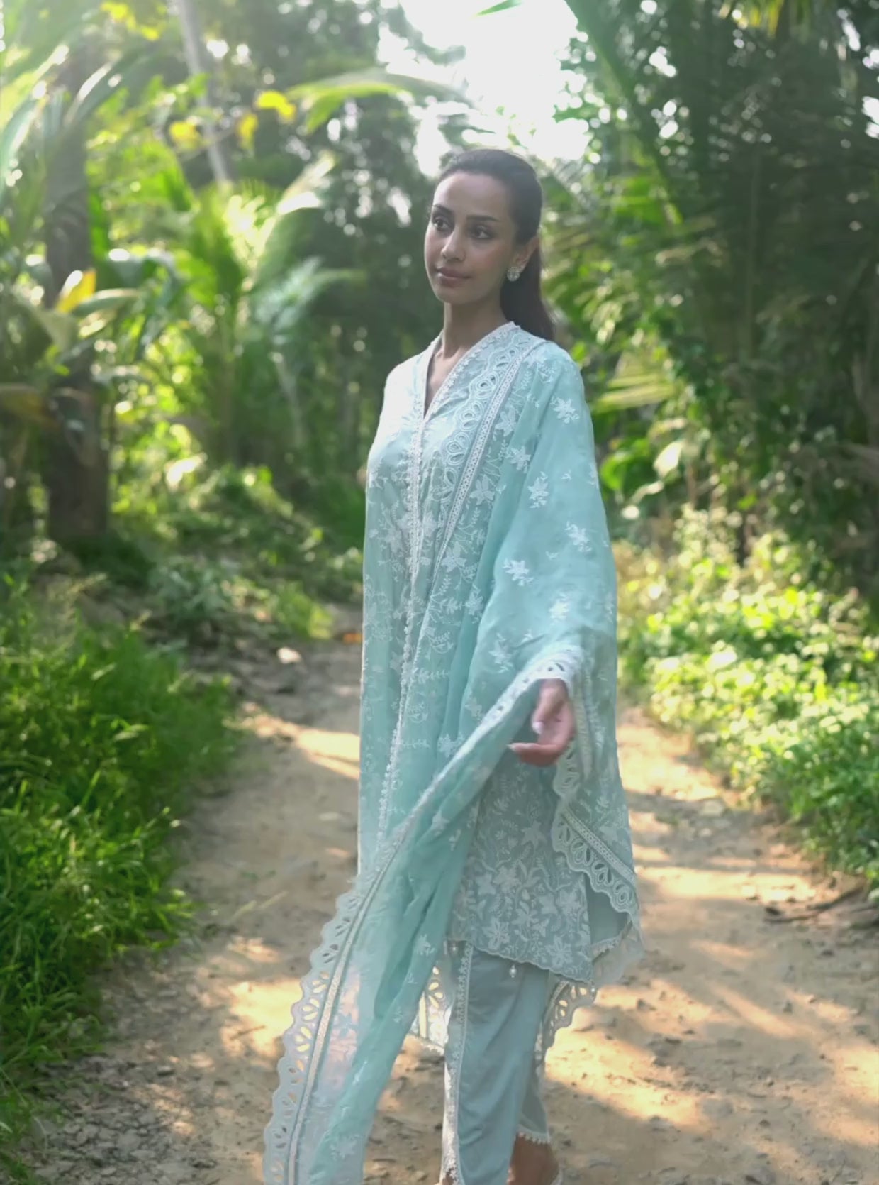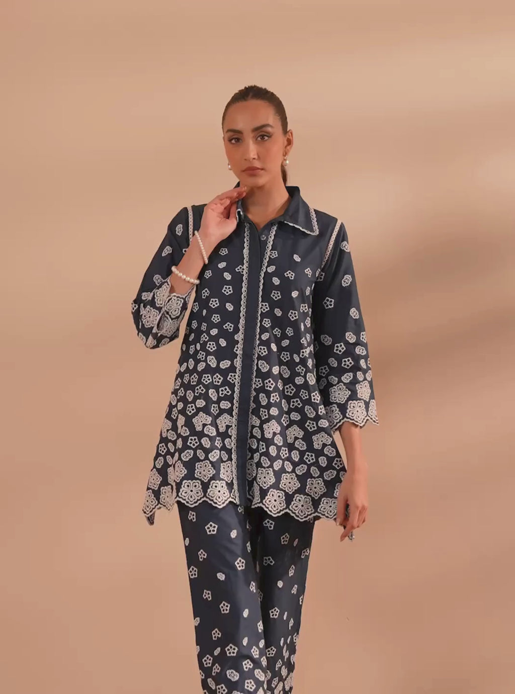 Zeenat Steel Blue Mulmul Supima Cotton Top Set