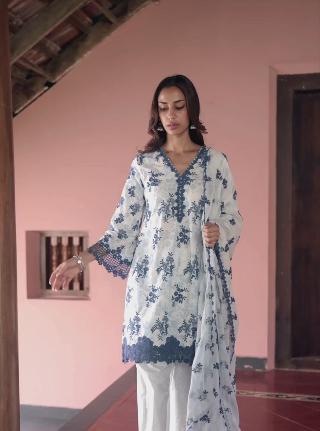 Nelea Supima Cotton Off White Kurta With Floral Chemical Lace Pant