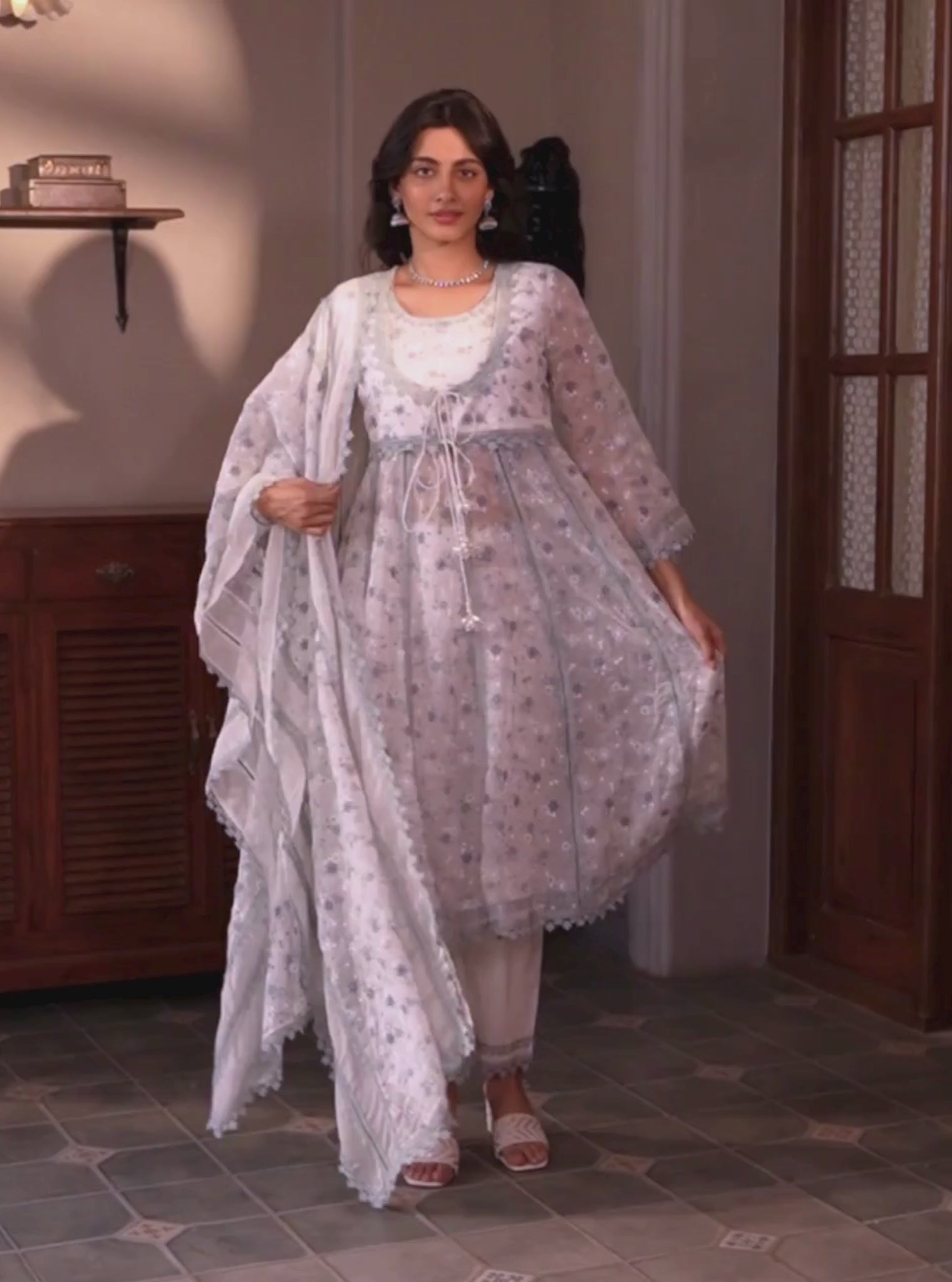 Idika Organza Printed White Anarkali Kurta Set
