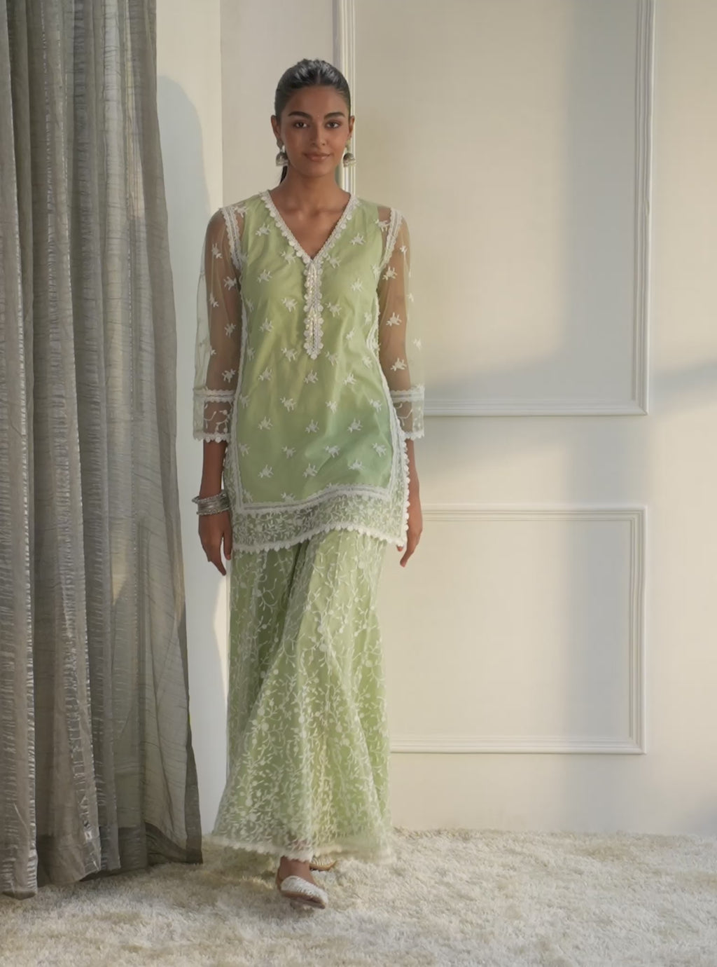 Odyssey Net Green Kurta with Sharara Set