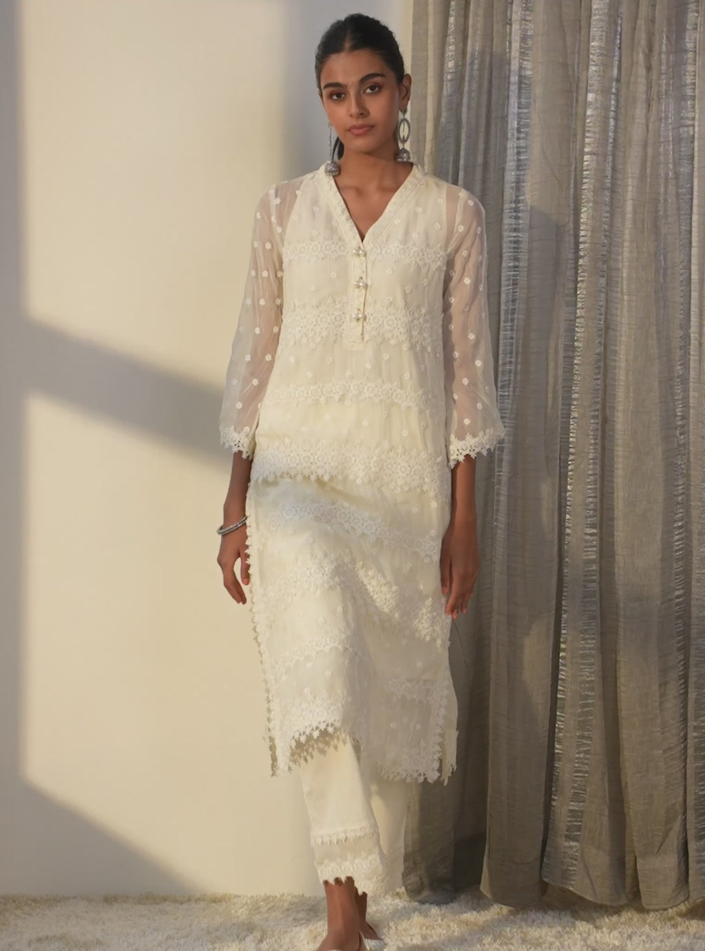 All kurtas feature intricate embroidery work and delicate lace details. Expert attention to detail is obvious in the pearl detailings featured in some of the kurtas. With the quintessential Mulmul touch, they radiate timeless sophistication and delicate feminity,