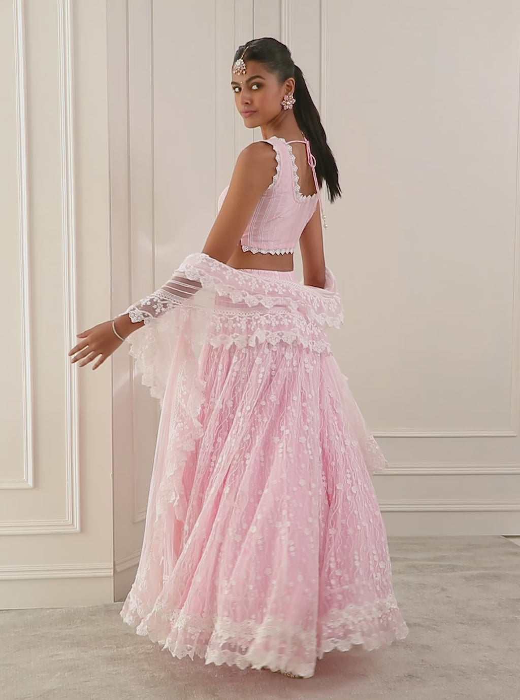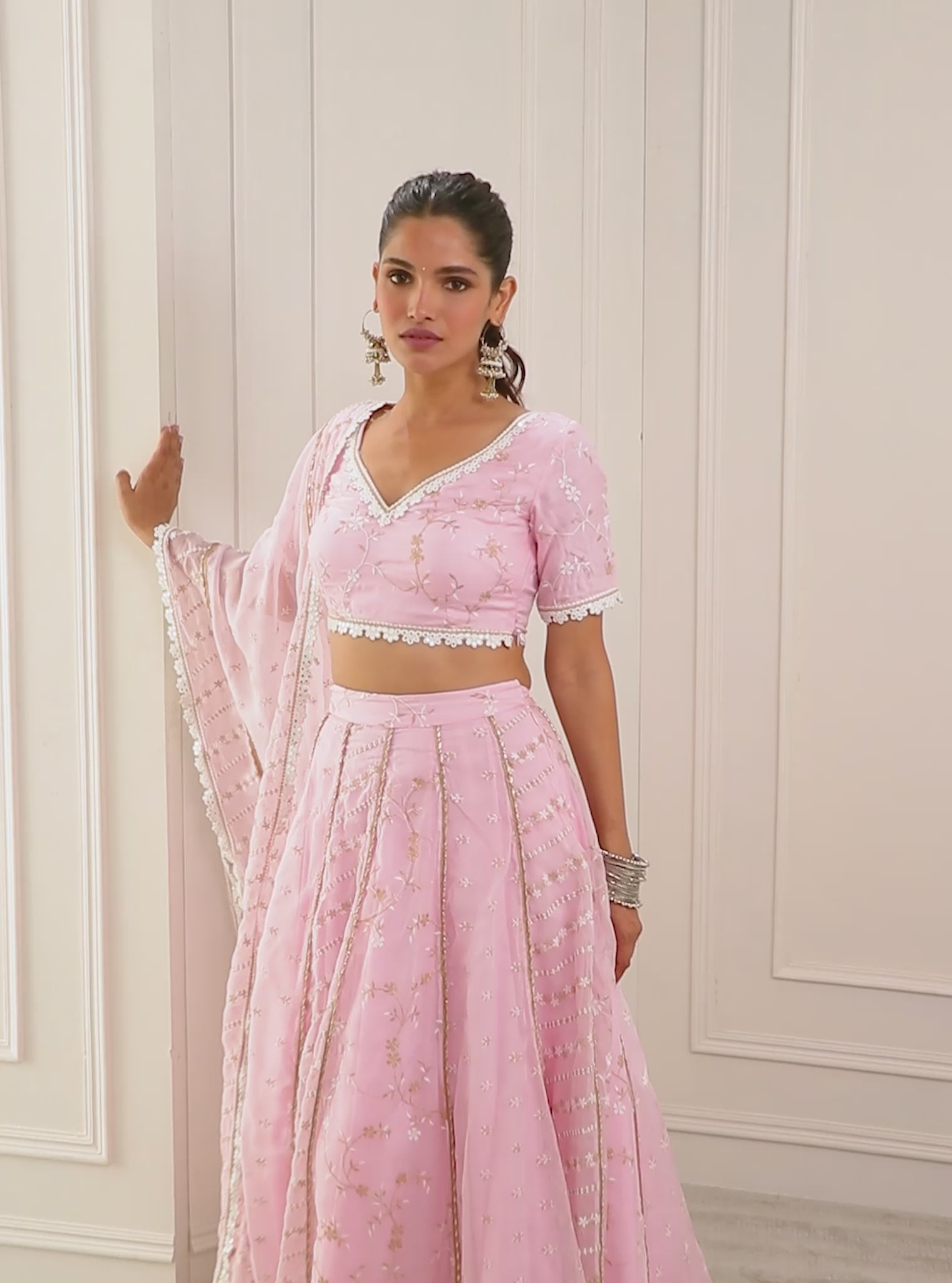 Mulmul Cupro Satin Printed Jhanak Pink Lehenga