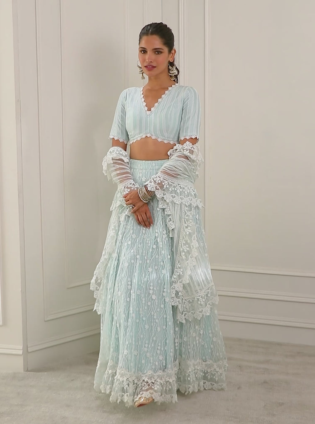 This combination allows for endless styling possibilities. For weddings, heavily embroidered or sequined blouses paired with rich fabric lehengas create a regal look. For festive occasions, simpler lehengas with lightly adorned blouses offer elegance and comfort. The addition of a matching or contrasting dupatta completes the ensemble, adding grace and sophistication.