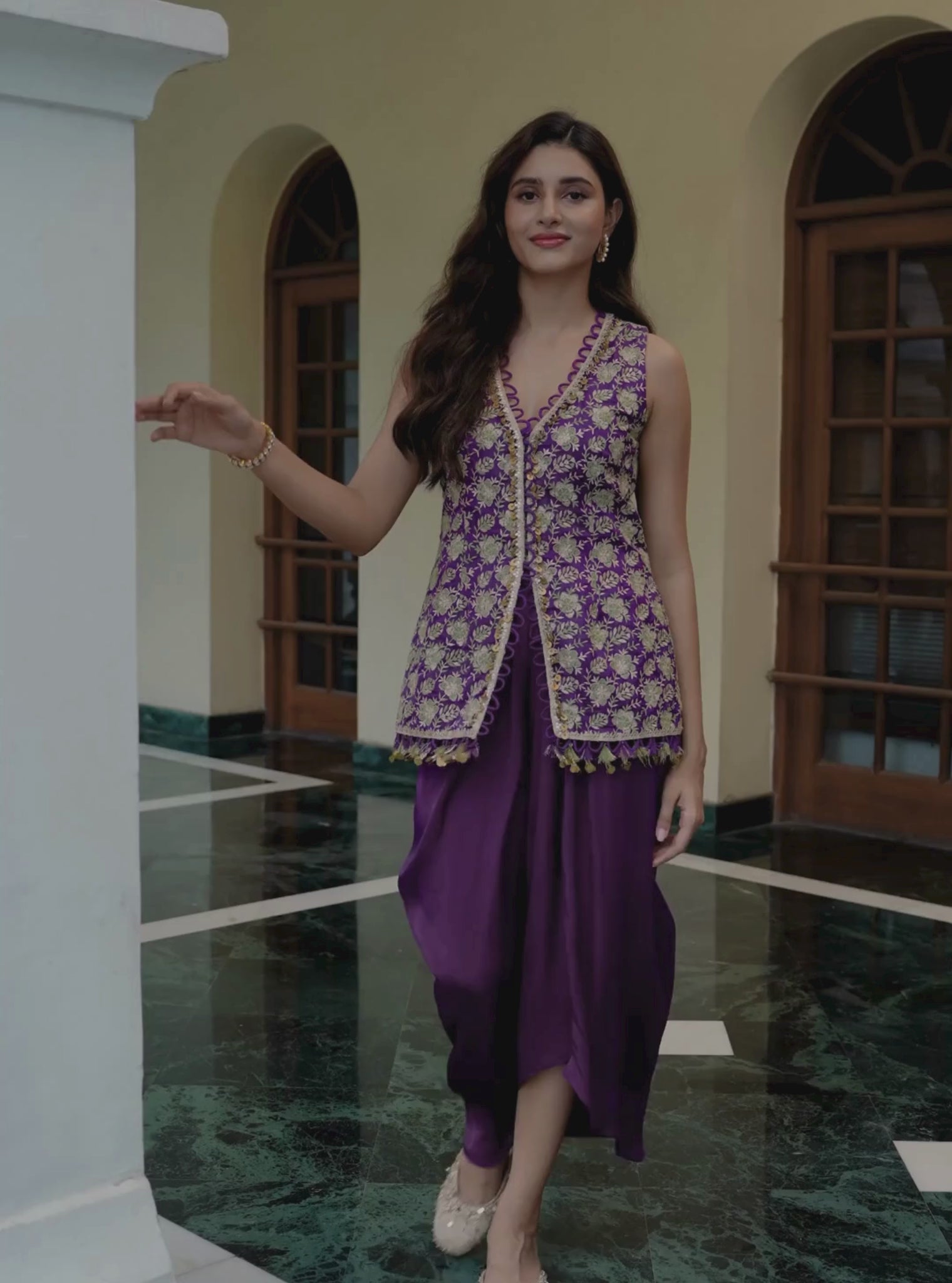 Kuhu Cupro Satin Printed Fuchsia Waistcoat with Wide Pleated Skirt