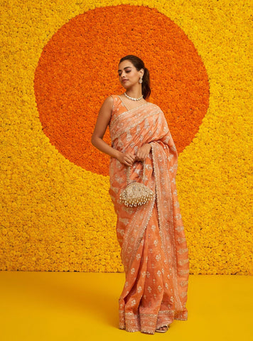 Step Into The Spotlight With This Elegant Saree, Exuding A Timeless Charm. Executed In A Rich, Burnt Orange, This Saree Is Adorned With Intricate Silver Zari Embroidery, Forming Delicate Regal Traditional Motifs All Along The Fabric. The Border Features A Detailed Pattern That Adds A Regal Touch To The Overall Design. Whether It'S A Grand Celebration Or An Intimate Gathering, This Saree Ensures You??Ll Be The Center Of Attention, Radiating Grace And Poise.