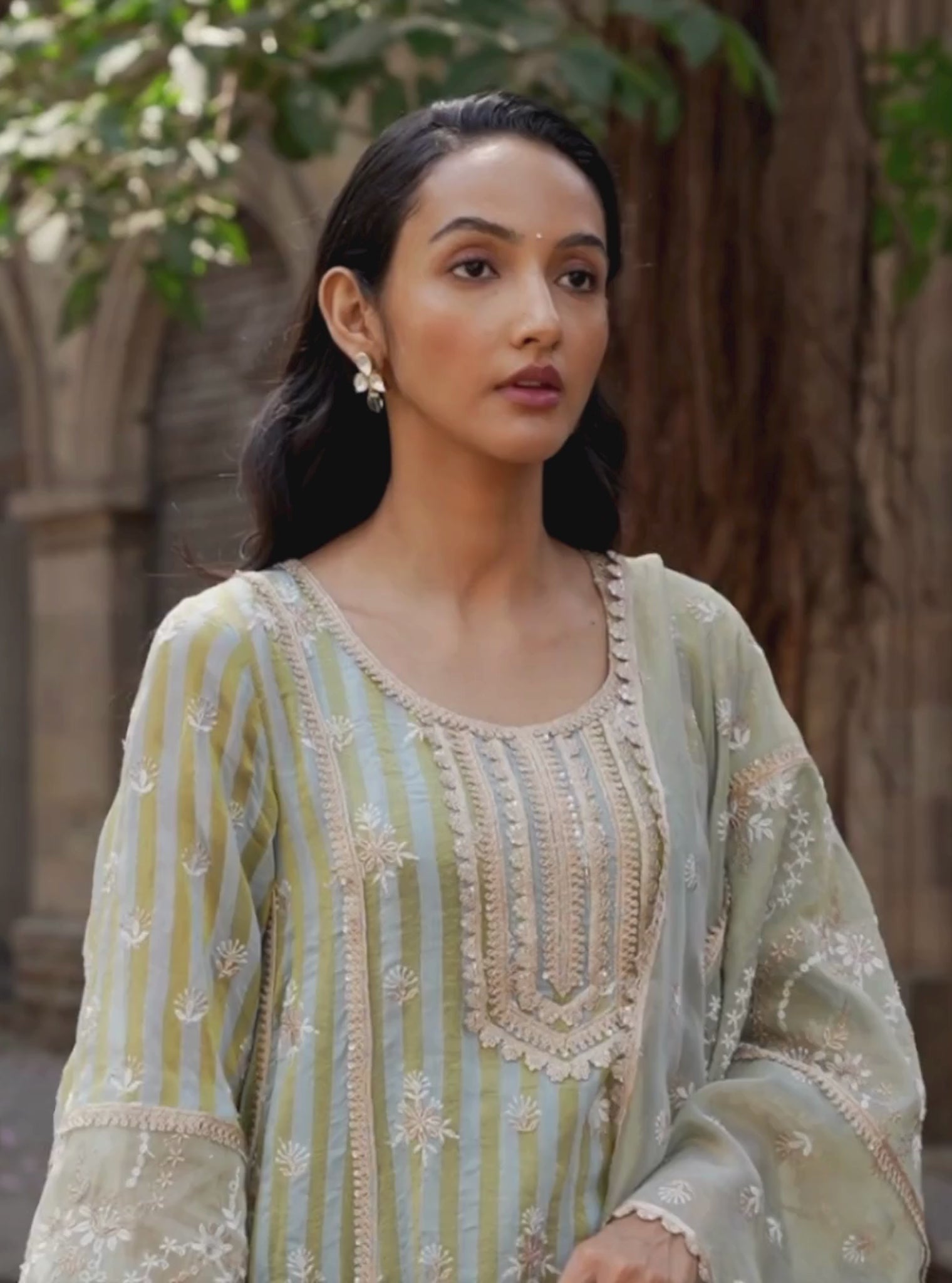 A Matching Organza Panel Graces The Lower Half Of The Kurta, Enhancing Its Gracefulness.