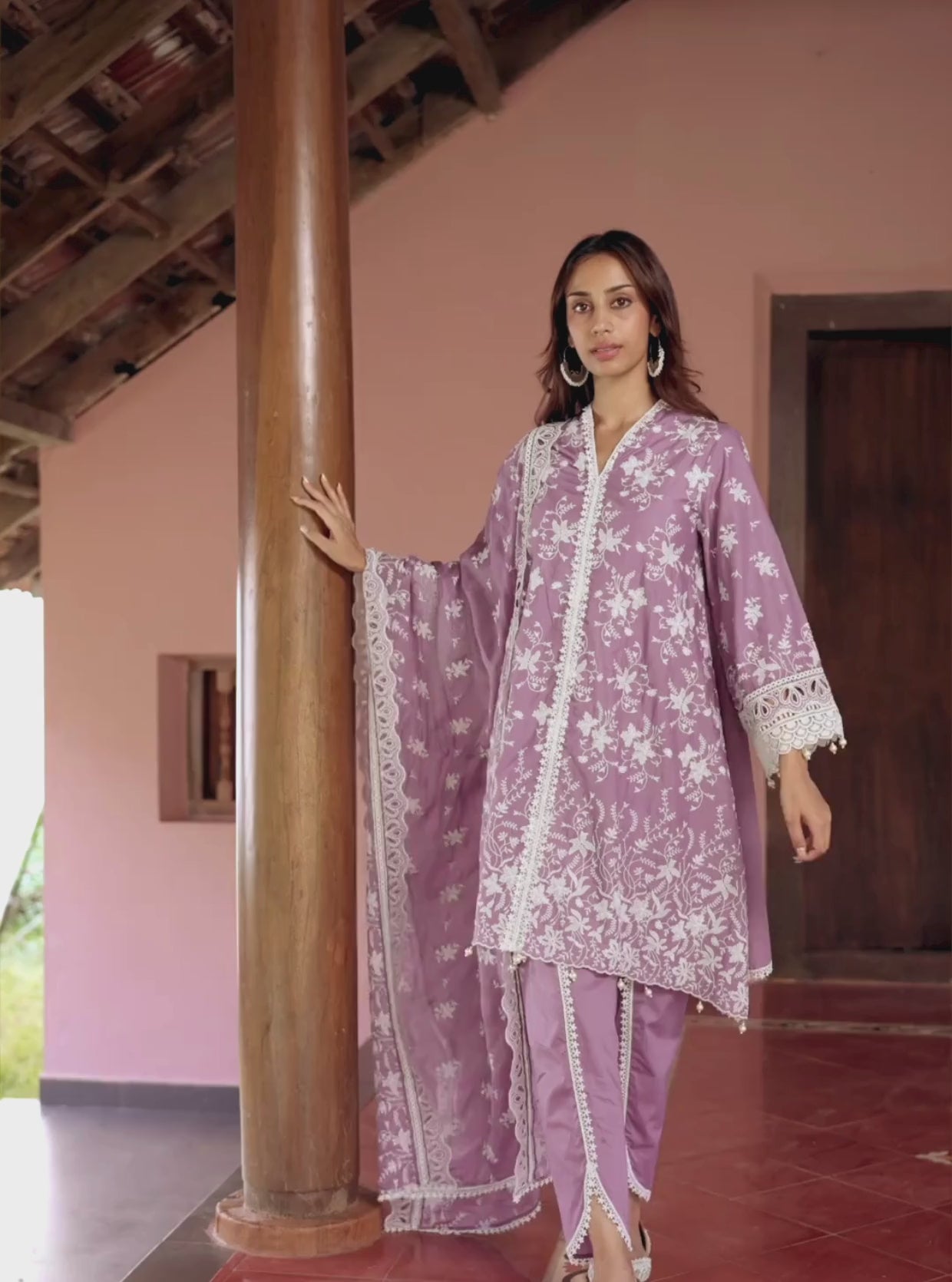 This Enchanting Violet Cotton Kurta Set Is A Celebration Of Grace And Femininity. The Kurta Is Beautifully Adorned With Intricate White Floral Embroidery. The A-Line Silhouette Is Elevated By The Softly Scalloped Hem, The Finely Crafted Lace Detailing On The Sleeves, And The Dainty Tassels.