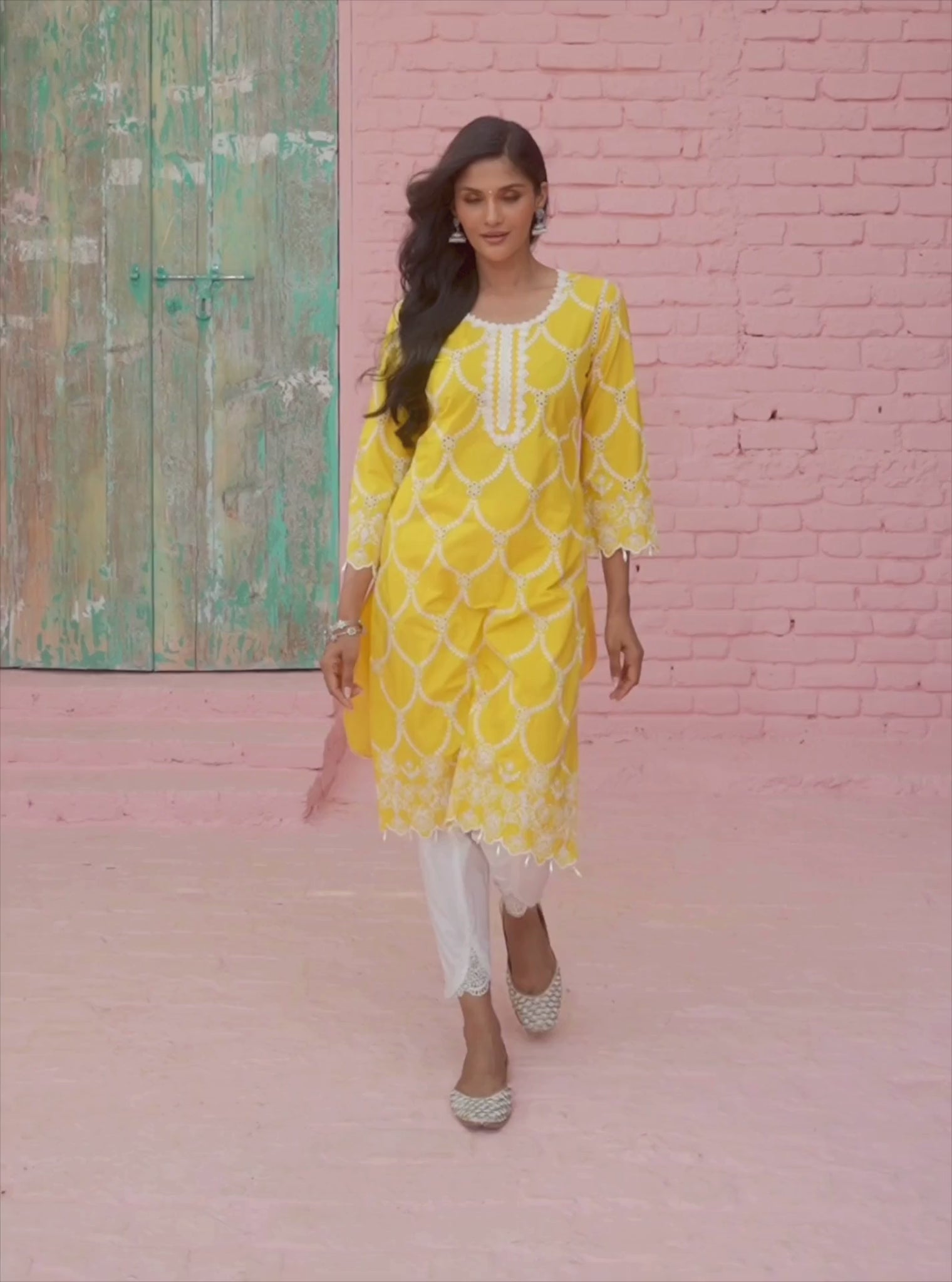 Pair The Kurta With The Matching Yellow Dupatta, Featuring Scalloped Edges And Delicate Embroidery All Over.?ÿ