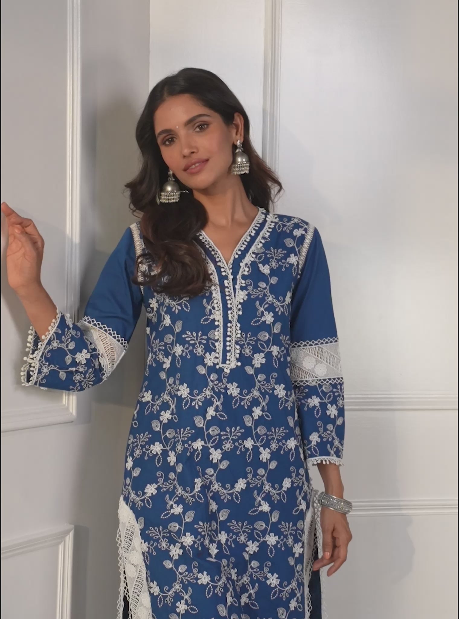 An All-New Take On A Classic Straight Silhouette, The Alice Long Kurta Showcases Well-Spaced Floral But Is With Broader Cutwork Panels In White Along The Hems And Across The Sleeve. Finished With A V Neckline And Straight Pants With Diagonally Running Matching Cutwork Panels And A Pleated Border, The Set Is Ready For An Evening Out!