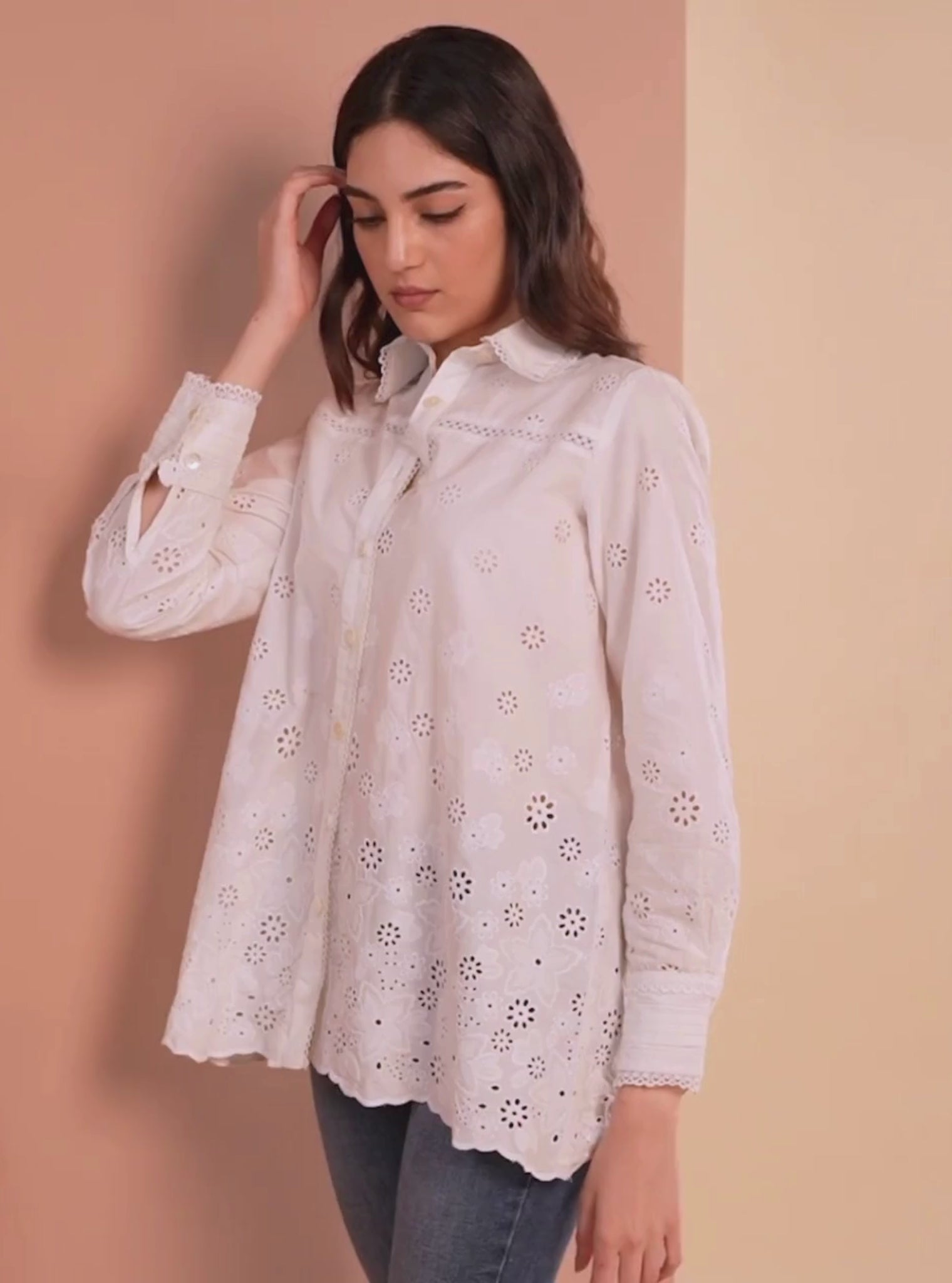 The One Thing That Will Never Go Out Of Style Is A Crisp White Shirt. This Is An Elevated Version Of That. Adornedwith Floral Cut-Out Details, A Refined Collar, And Lace Trimmings, This Is The Quintessential Elevated Basic For Your Wardrobe.