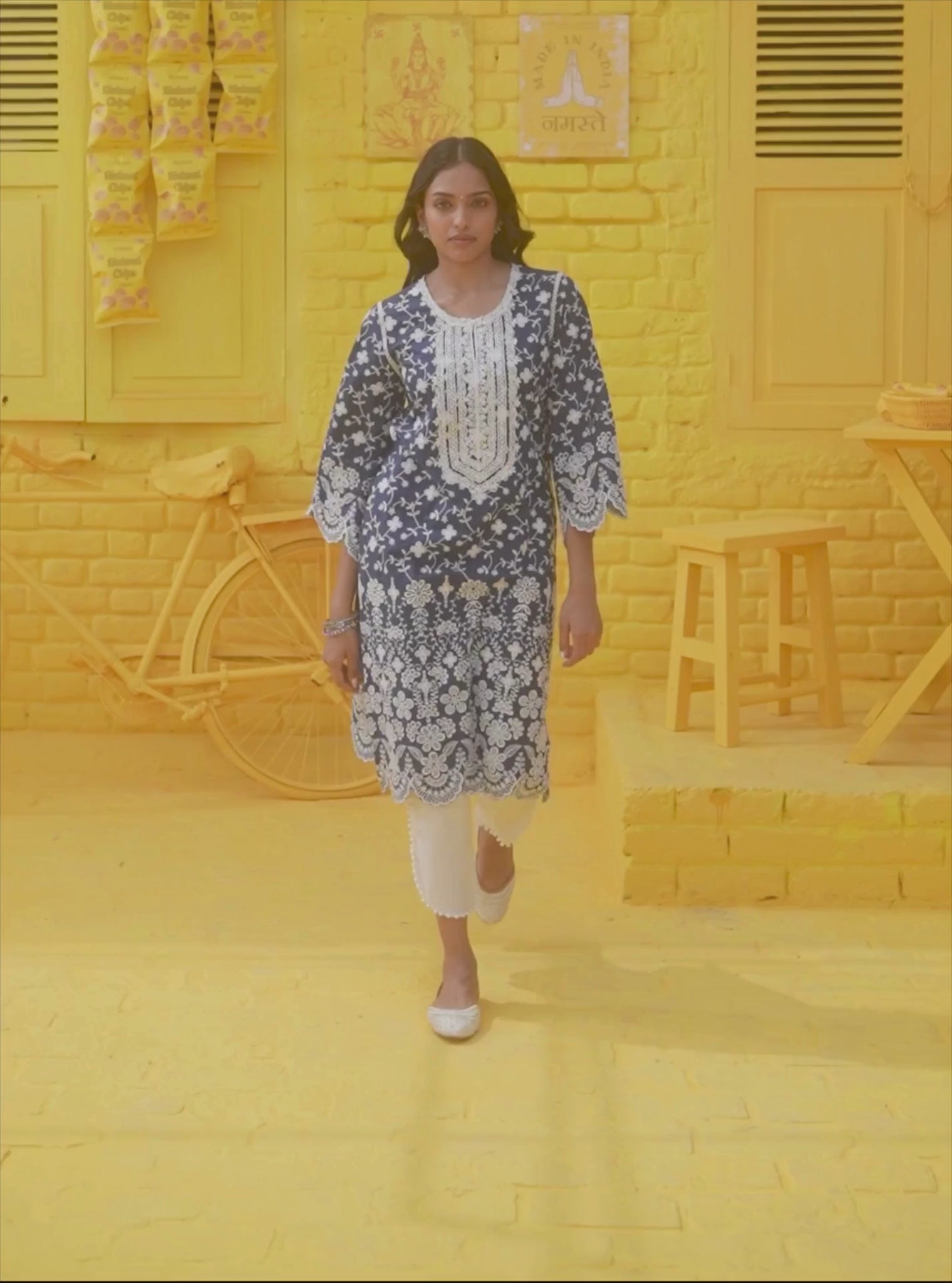 This Regal Navy Kurta Set Perfectly Blends Tradition And Contemporary Flair. The Kurta Is Adorned With Delicate White Floral Motifs That Stand Out Beautifully Against The Deep Blue Fabric, Creating A Captivating Contrast. The Round Neckline Is Adorned With Intricate Embroidery, While The Sleeves And Hemline Are