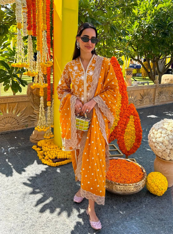 The Classic V-Neckline Is Bordered With Intricate Gotta, Which Also Adorns The Front Placket. The Three-Quarter Sleeves Are Finished With The Same Gotta Detailing, Adding A Delicate Touch To The Ensemble.