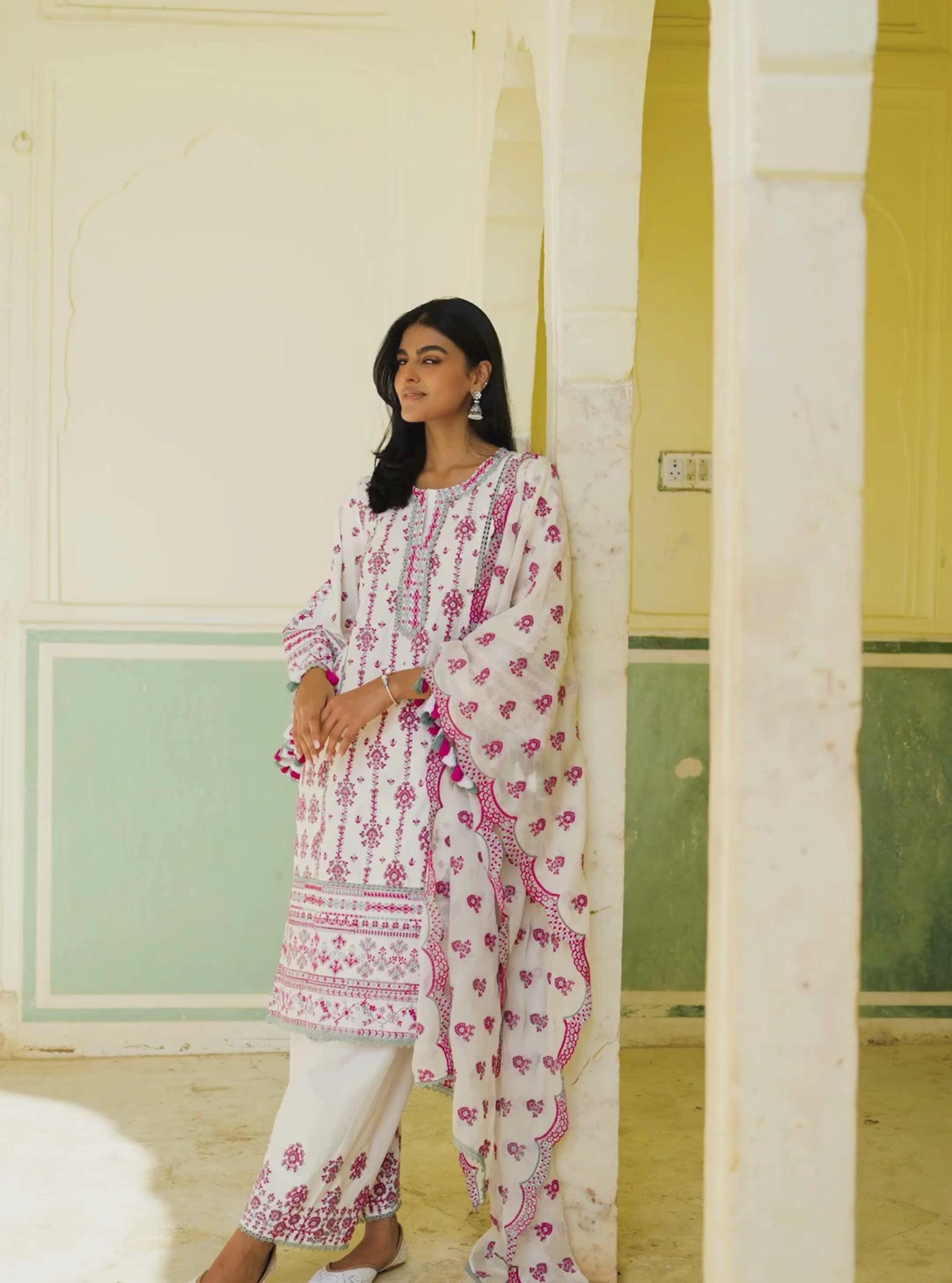 The Lomeya Kurta Set In White &Amp; Fuschia Brings Joyful Colour To Classic Craftsmanship. Set On Soft Mulmul Cotton, The Kurta Features Intricate Embroidery In Vibrant Fuschia, Teal, And Mint. The Round Neckline Is Highlighted With A Split Placket And Tonal Lacework. What Truly Sets This Set Apart Is The Bell Sleeves; Finished With Multi-Panel Embroidery, Looped Lace, And Metallic Gold-Beaded Tassels For A Luxe Handcrafted Finish. The Matching Pants Are Embroidered Along The Hem And Scalloped With Lace Trims. A Matching Printed Organza Dupatta With Scalloped Borders Completes The Look; It'S Lightweight Yet Statement-Making.
