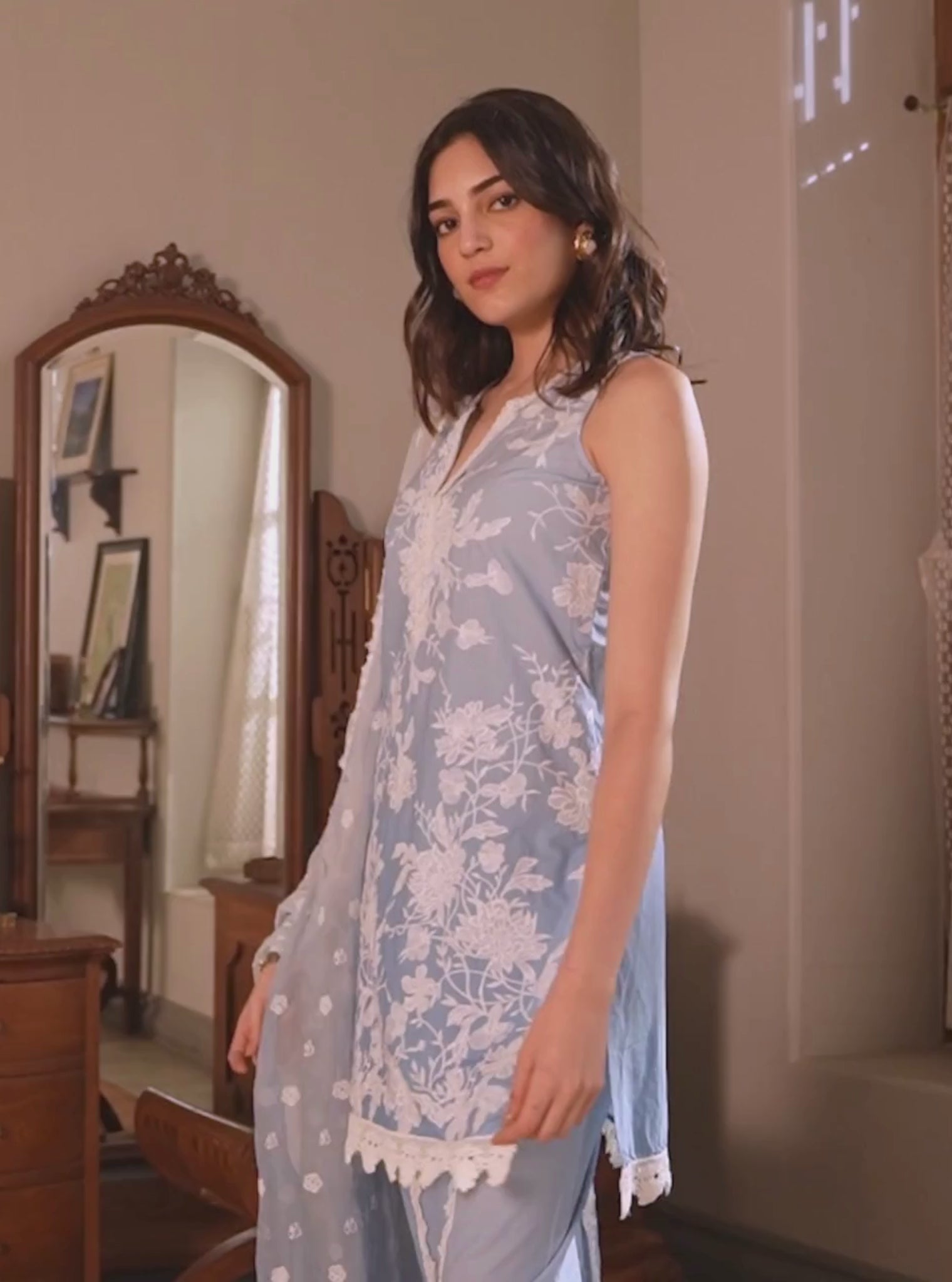 A Whimsical Blue Ensemble That Whispers Of Youth And Romance. The Sleeveless Kurta, With Its Graceful V-Neckline, Is Adorned With Delicate White Lace Details And Charming Floral Embroidery. Adding An Extra Touch Of Femininity, A Lace Trim Graces The Hemline.