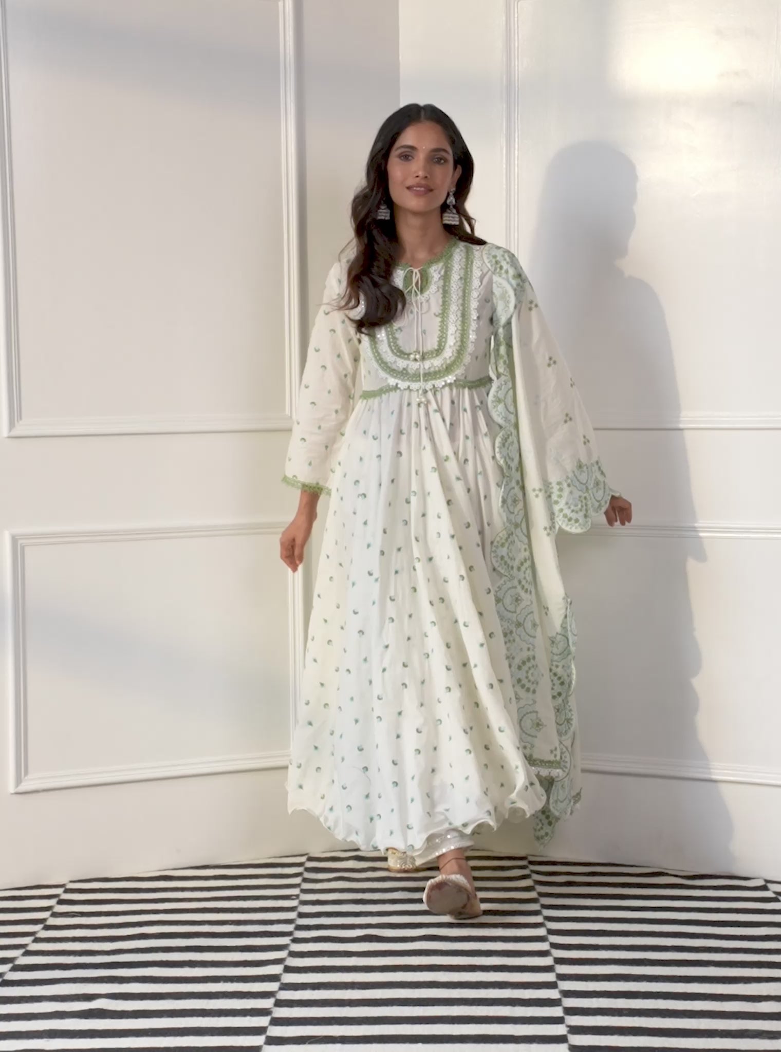 The Nadine Set In White Is A Showstopper, With Added Flair And Drama The Kurta Is Cinched At The Waist With Green Lace That Runs Over The Sleeves As Well Bringing Out The Colour. The Neck Panel Is Of Interesting Details With Multi-Coloured Lace Trims That Add To The Femininity Of The Piece Finishing Up In A Key-Hole Neckline. The Lengths Of The Kurta Are Covered In Miniature Blue And Green Floral Butis But The Highlight Of The Set Remains The Flared Asymmetric Hems That Add A Flounce To It.