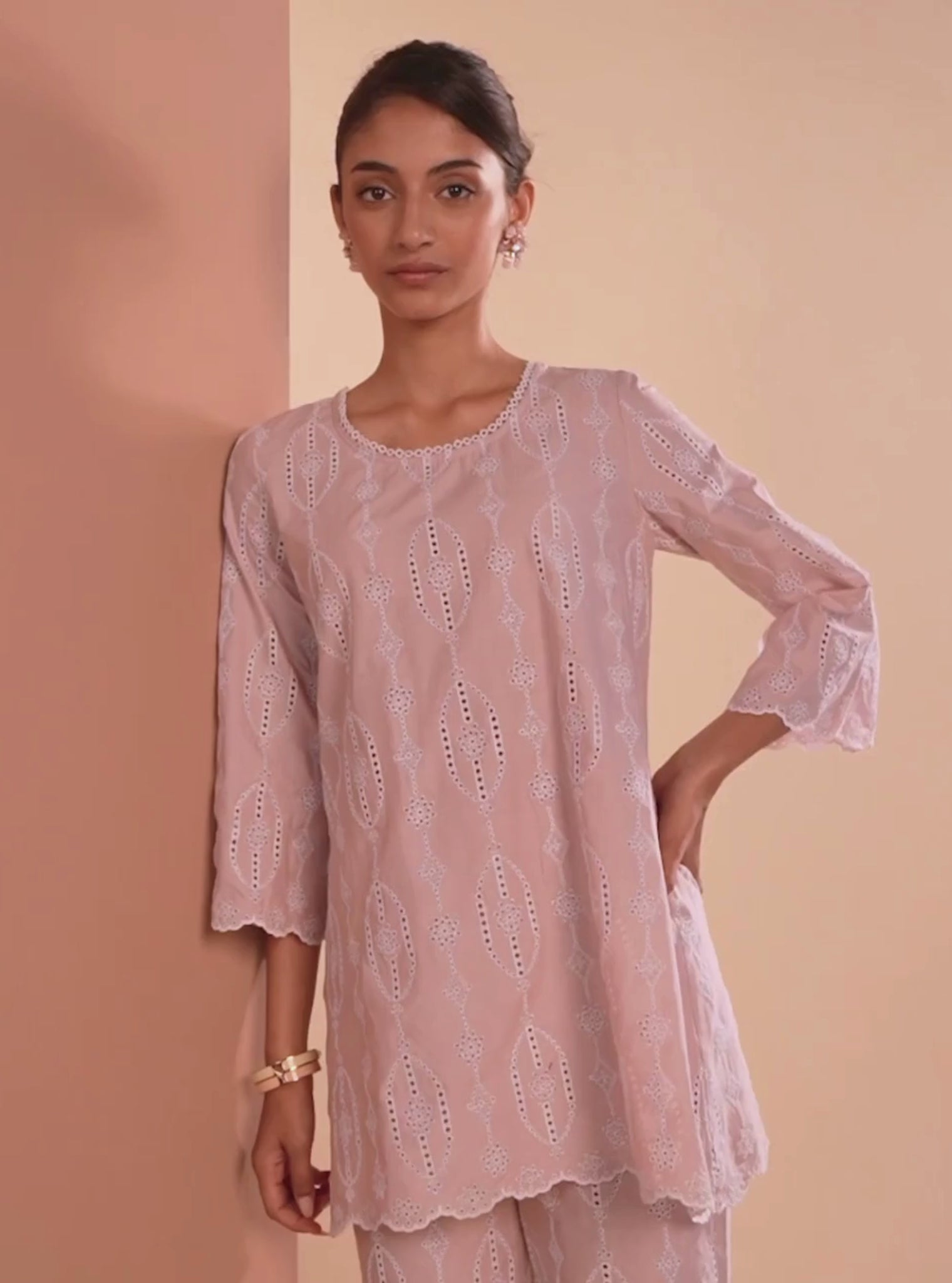 Effortlessly Chic, This Delicate Pink Co-Ord Set Is A Versatile Addition To Your Summer Wardrobe. Adorned With Contrasting White Thread Line Embroidery All Over, It Features Lace Detailing Around The Neckline And Scalloped Sleeves And Hem. Whether You'Re Heading To The Office Or Enjoying A Leisurely Brunch With Friends, This Versatile Ensemble Effortlessly Transitions To Suit Any Occasion. With Its Timeless Elegance And Adaptability, This Co-Ord Set Promises To Be A Staple In Your Wardrobe Rotation.
