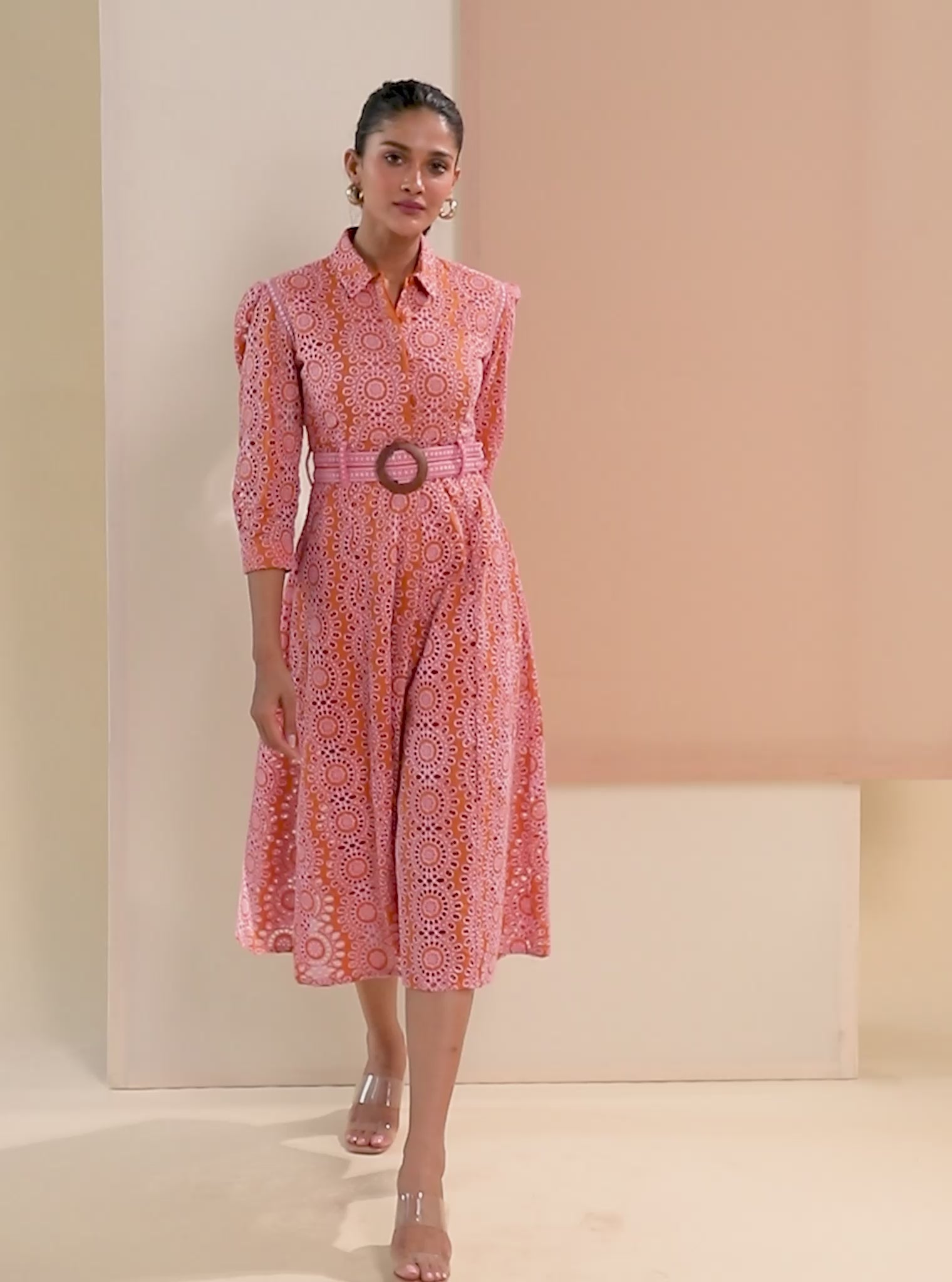 The Remy Dress In Orange Is The Perfect Summer Look With Vertically Running Cutwork Embroidery. The Dress Comes With A Crisp Collar, 3/4Th Sleeves And An Attached Lace Belt To Finish The Look.