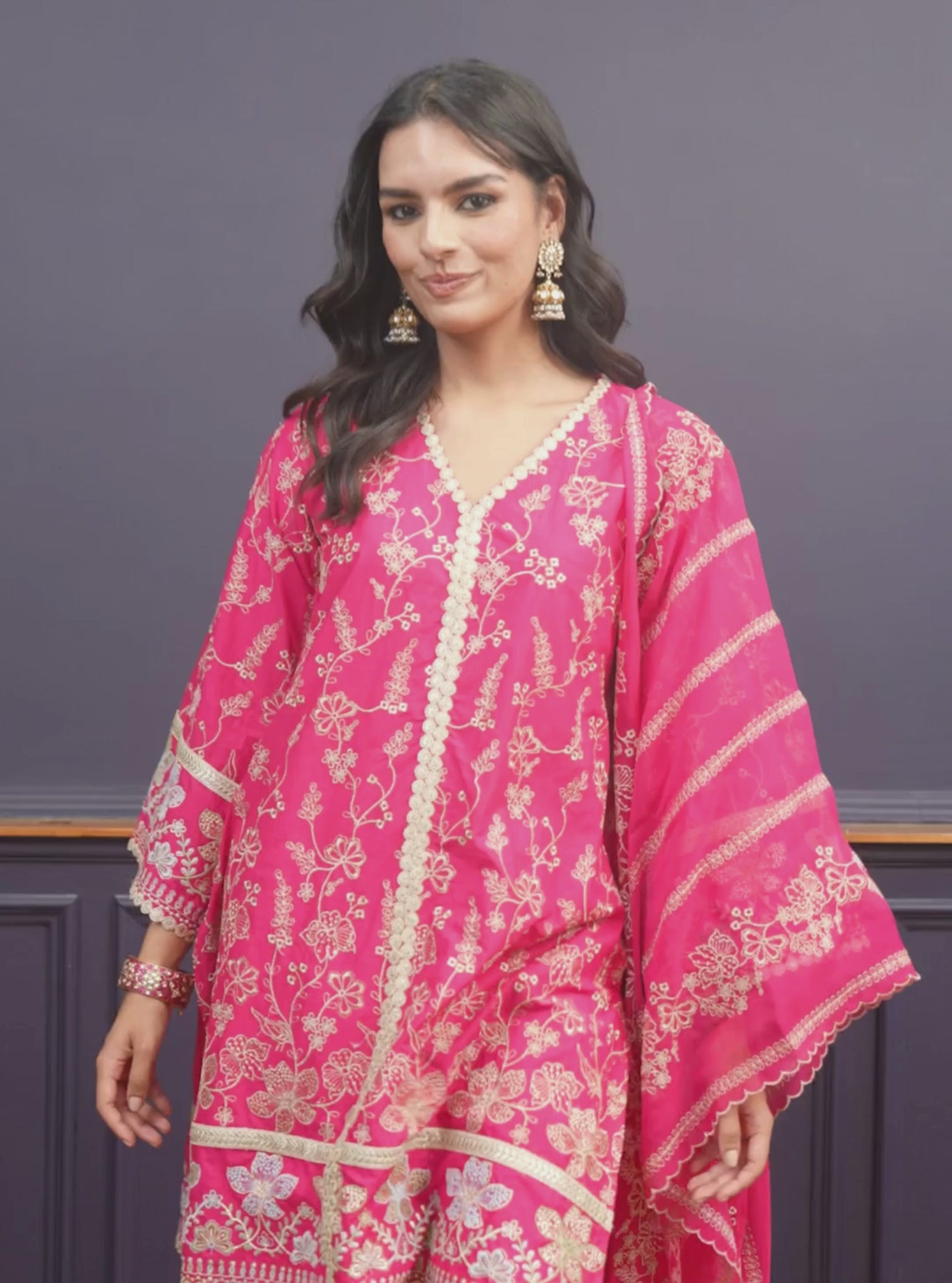 Crafted In Breathable Cotton, The Rina Kurta Set In Fuschia Brings Together Comfort And Vibrance. The Kurta Features Intricate Thread Embroidery And Lace Inserts That Elevate Its Simple Silhouette. Paired With Matching Cotton Pants And An Organza Dupatta Detailed With Tonal Motifs And Scalloped Edges, This Set Is Perfect For Bright Festive Mornings And Warm Family Gatherings
