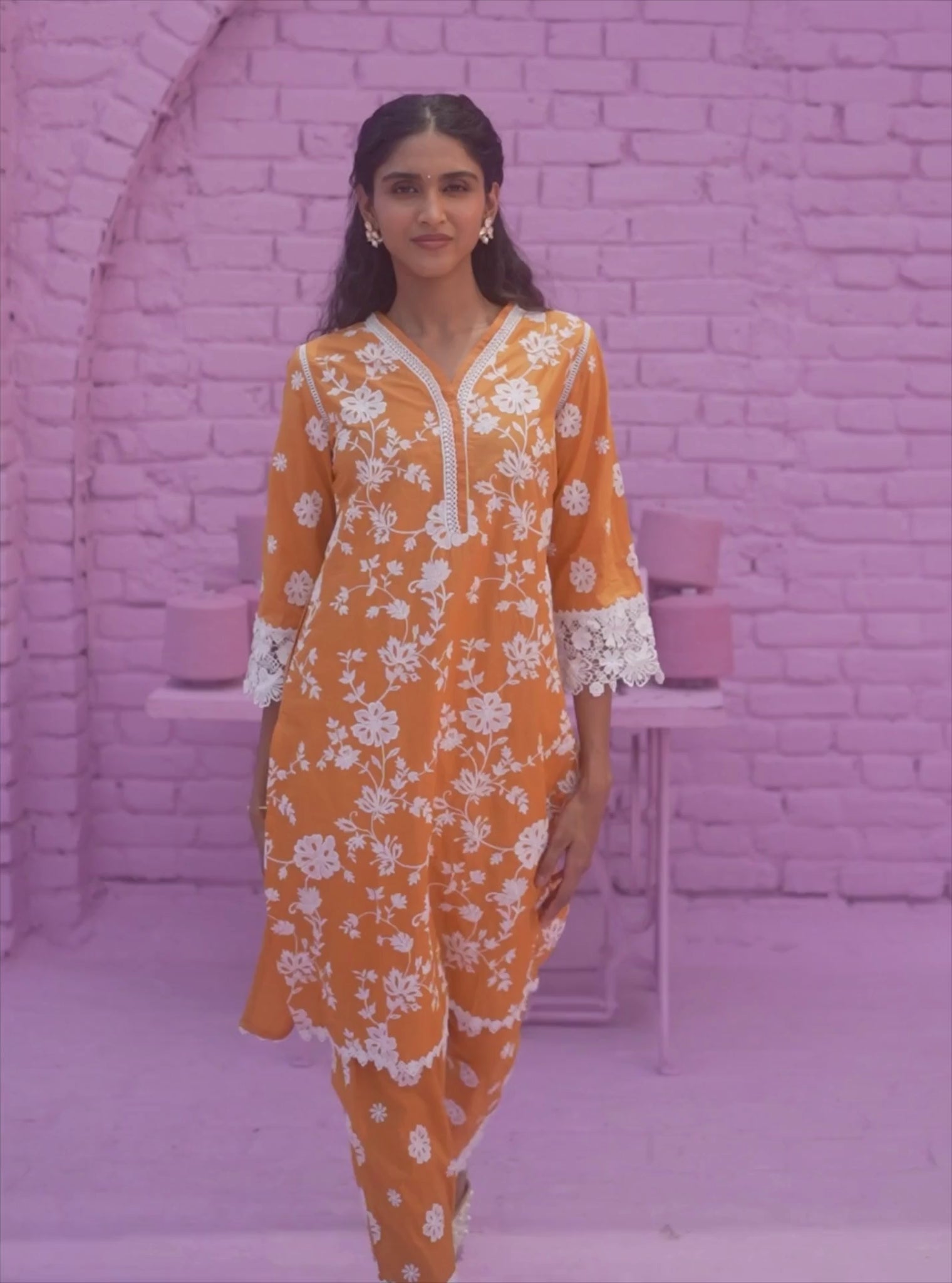 A Vibrant Orange Kurta Set, An Epitome Of Elegance And Charm. This Kurta Set Effortlessly Blends Traditional Aesthetics With Contemporary Design, Making It A Perfect Choice For Various Occasions. The Kurta Is Adorned With Delicate White Floral Embroidery That Stands Out Beautifully Against The Vibrant Fabric. The V-Neckline And Sleeves Are Highlighted With Intricate White Lace Detailing,?ÿ Complementing The Kurta, The Straight Trousers Feature Similar Embroidery And Lace Trims At The Cuffs.?ÿ