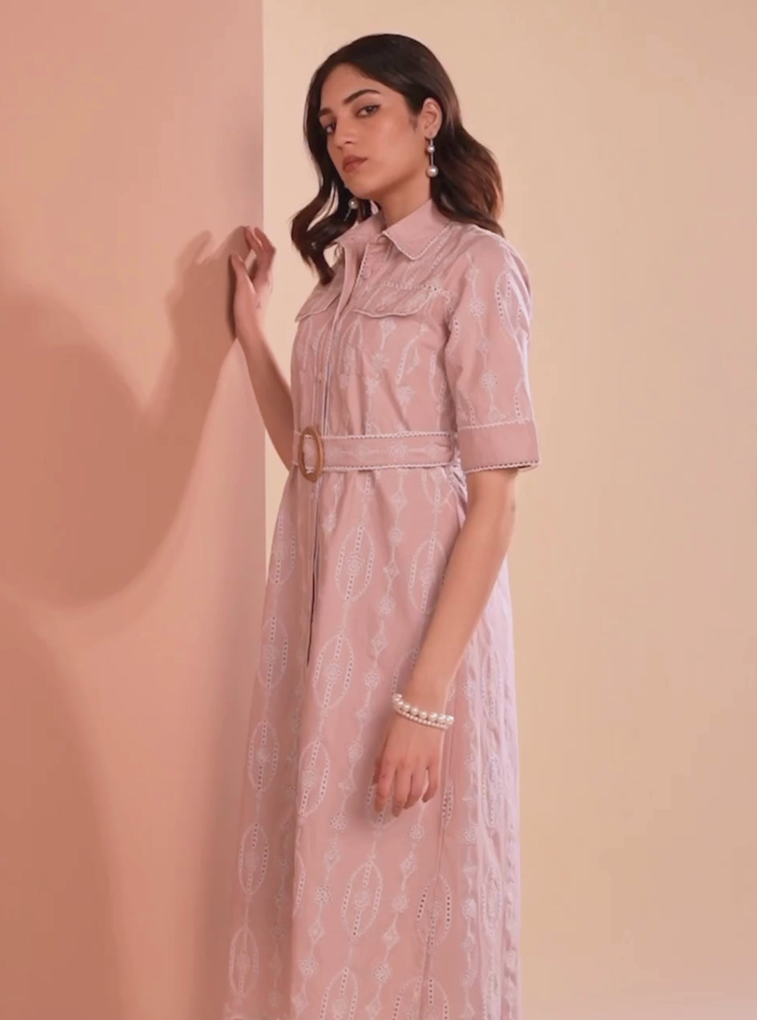 An Understated Outfit That Embodies The Essence Of Minimalist Elegance. This Midi Shirtdress In A Delicate Pinkfeatures Refined Collars And Cuffed Sleeves, Exuding A Timeless Charm. Delicate Cut-Out Detailing Adorned With Intricate White Thread Embroidery Adorns The Dress, Adding A Touch Of Refinement. A Matching Belt, Featuring A Statement Buckle, Effortlessly Completes The Ensemble, Elevating Its Elegance To Perfection.