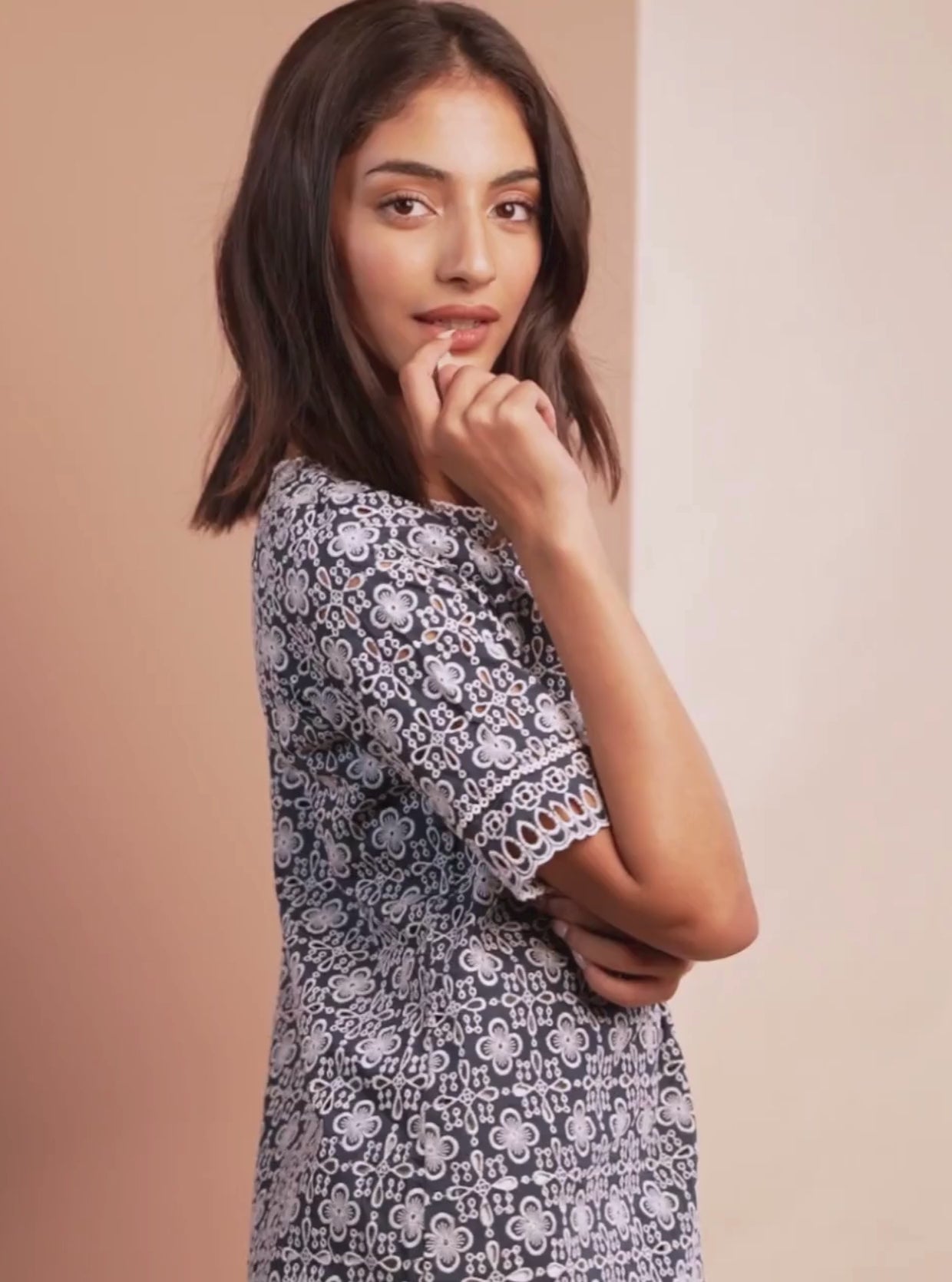 A Stunning Addition To Your Summer Wardrobe. The Round-Neck, Short-Sleeved Top, Features Intricate White Thread Embroidery All Over On A Rick Navy Base. Dress It Up With A Pair Of Flared Trousers, Or Dress It Down With Denim, This Top Is As Versatile As It Is Chic.