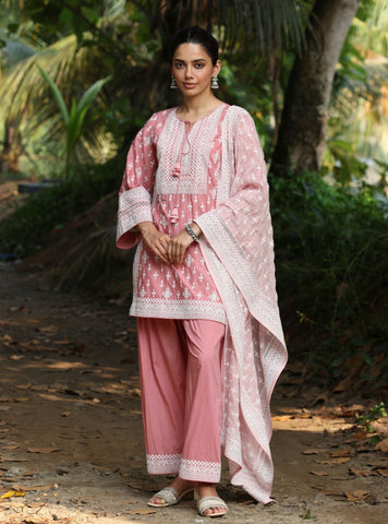 Embrace Summer With This Classic Black And White Kurta Set, A Perfect Blend Of Comfort And Tradition. The Relaxed-Fit Short Kurta, Adorned With Delicate Black-Threa Embroidery, Exudes An Understated Charm That Is Both Timeless And Versatile. Framed With Intricate Geometric Borders And A Tie-Up Neckline With Tassels, This Piece Brings An Artisanal Touch To Everyday Dressing. Paired With Broad Palazzo Pants, This Set Offers A Breezy Silhouette, Making It An Ideal Choice For Warm Summer Days. The Coordinating Dupatta, Adorned With Intricate Patterns And A Striking Contrast Border, Adds A Regal Flair To The Ensemble.