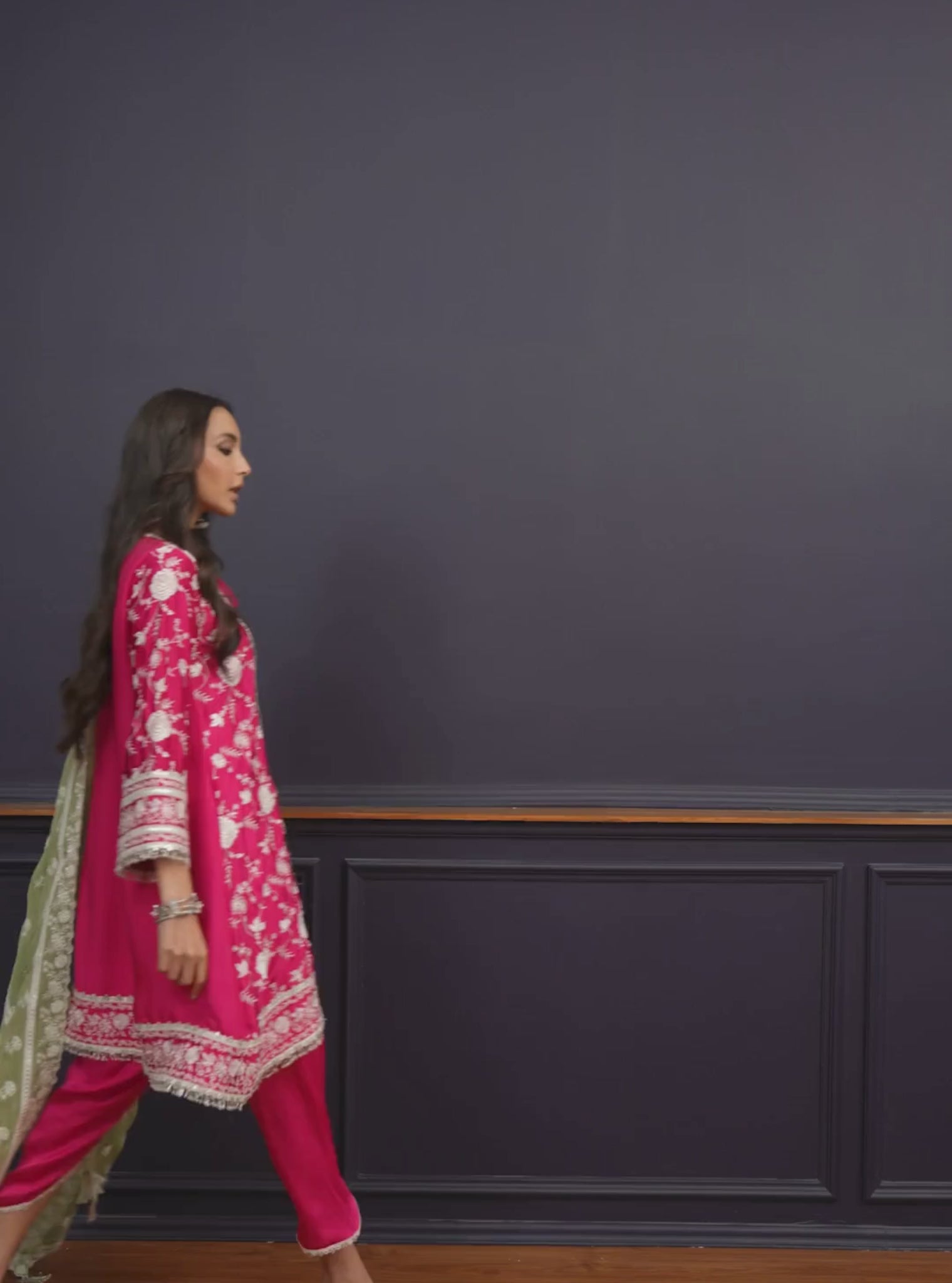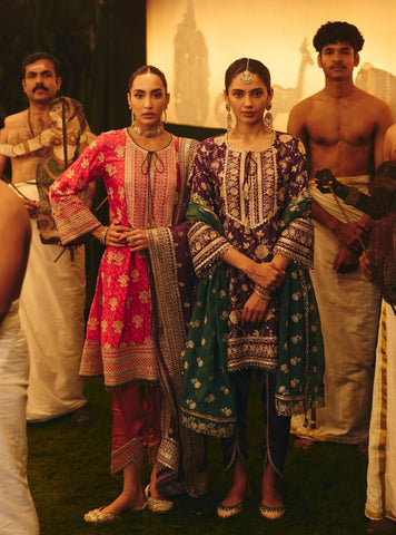 Playful And Celebratory, This Fuschia Cupro Satin Kurta Is Cut In A Flattering A-Line Silhouette. Dhoti Pants Bring Ease And Movement, While The Pista Green Organza Dupatta Adds A Soft, Complementary Finish. A Perfect Blend Of Bold And Balanced.