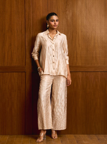 Rendered in a rich red, this Santree shirt set balances structure with movement. The cupro satin fabric adds a subtle sheen while remaining breathable and light, ideal for extended celebrations. Designed to work as a coordinated set or styled separately, its a strong option for festive and intimate wedding events.