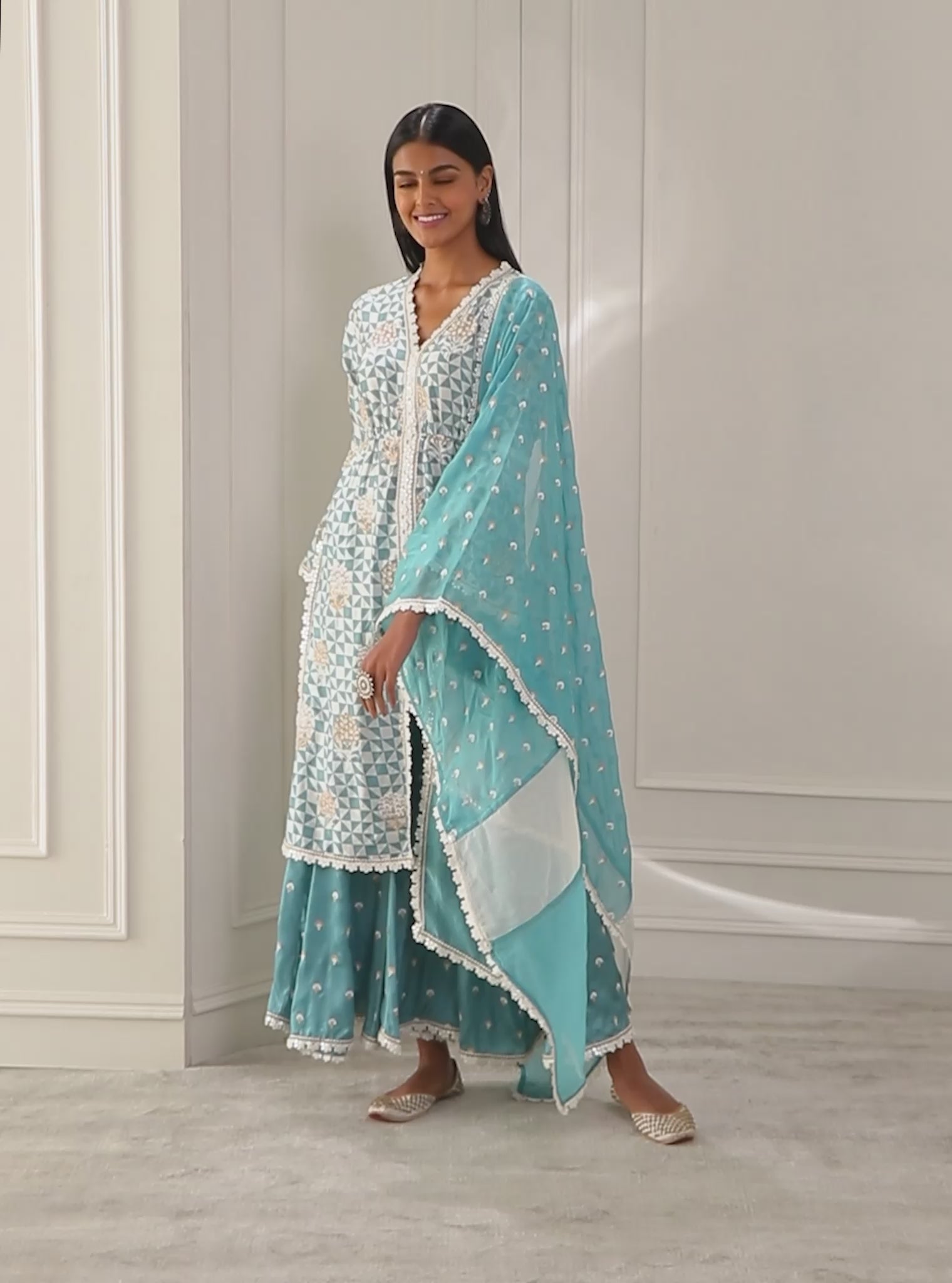 Our Newest Show Stopper In Luxurious Cupro Silk Comes With A Long Straight Kurta Split At The Hem, Highlighted With Floral Lace Trims And Zari Work. The Piece Has A Base Of Geometric Print And Is Worked Over With White Thread And Zari In Floral Motifs, Finished With Fit And Flare Sleeves Showcasing Mirror Work. The Outfit Comes With A Luscious Cupro Silk Garara With Complimenting Floral Bhutis And Lace Trims.