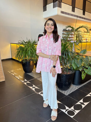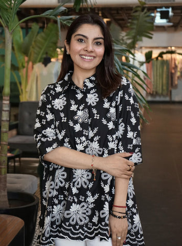 A Stunning Fuchsia Shirt With Contrasting White Thread Embroidery All Over, That Is A Fun Twist To A Wardrobe Basic. The Refined Collar Adds A Polished Touch, While The Asymmetrical Scalloped Hemline Maintains The Youthful Appeal. The Cutwork Details, Coupled With The Embroidery Are The Perfect Blend Of Artistry And Chic.