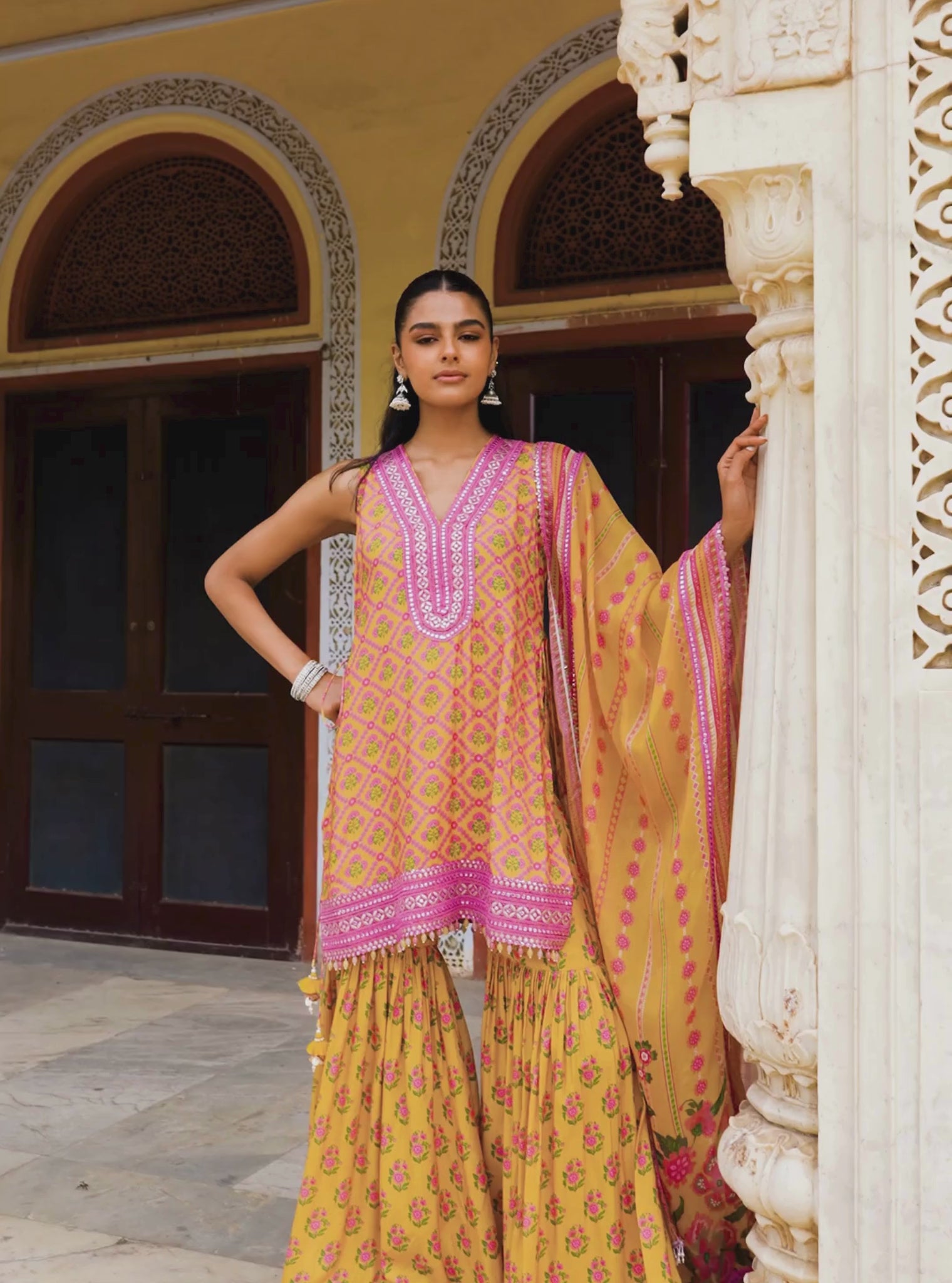 The Divaya Denim Kurta Set Pairs Mughal-Inspired Prints With A Contemporary Silhouette. The Sleeveless Lawn Kurta Features A Deep V-Neckline Embellished With Thread And Mirror Embroidery, Framed By Lace Borders. Paired With A Voluminous Sharara-Style Pant In Matching Print And Tonal Detailing At The Hem, The Look Is Full Of Movement. A Printed Organza Dupatta In Soft Yellow Tones With Scalloped Lace Completes This Fresh Take On Festive Dressing.