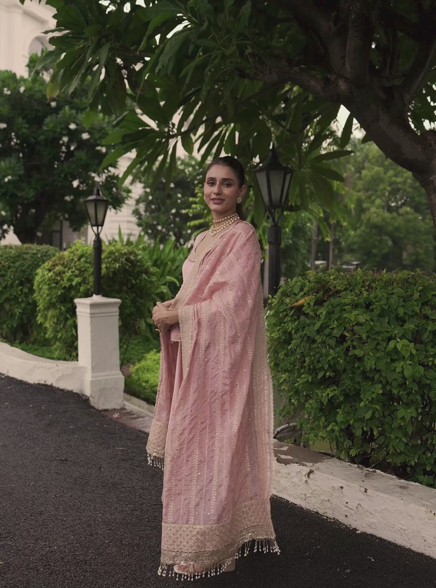 Steeped In Feminine Grace, This Pink Anarkali Set Is A Vision Of Elegance And Celebration. Crafted From Soft Linen Satin, The Voluminous Silhouette Drapes Effortlessly, Creating An Ethereal Flow. The Yoke Is Adorned With Intricate Detailing That Nods To Traditional Artistry, While Delicate Accents Along The Hem And Sleeves Lend A Regal Touch. Paired With Sleek Pima Satin Pants, The Look Is Elevated By A Matching Pink Viscose Glass Organza Luxe Mausami Dupatta -Sheer, Lightweight, And Finished With An Intricately Crafted Border.