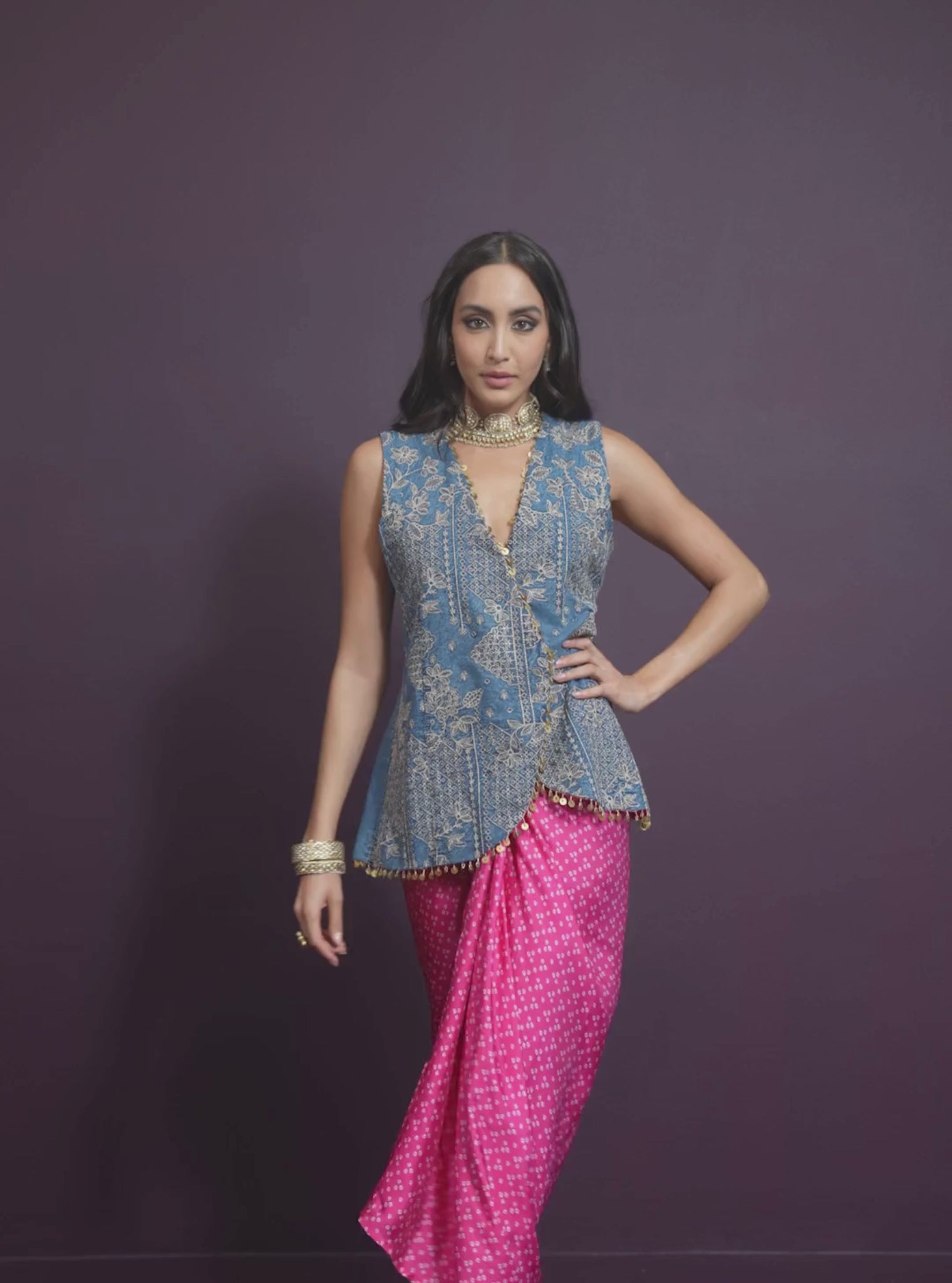 A Denim Jacket Paired With Interchangeable Cupro Satin Wrap Skirt In A Bold Fuschia Print. A Versatile, Statement-Making Set For Modern Celebrations.