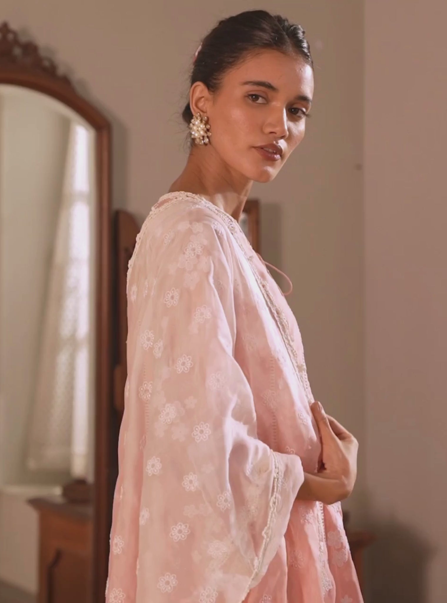 A Vision In Ethereal Organza, This Anarkali Set Whispers Romance In A Soft, Blush Pink Hue, An Ode To The Essence Of Summer. With A Subtle Ombre, It Feels As Light As It Looks. The Round Neckline Of The Kurta Features A Tie-Up Detail. Delicate Floral Embroidery, In White Thread, Adorns The Entire Kurta. Lace Trimmings Grace The Neckline, Sleeves, And Hemline, Adding A Touch Of Feminity.