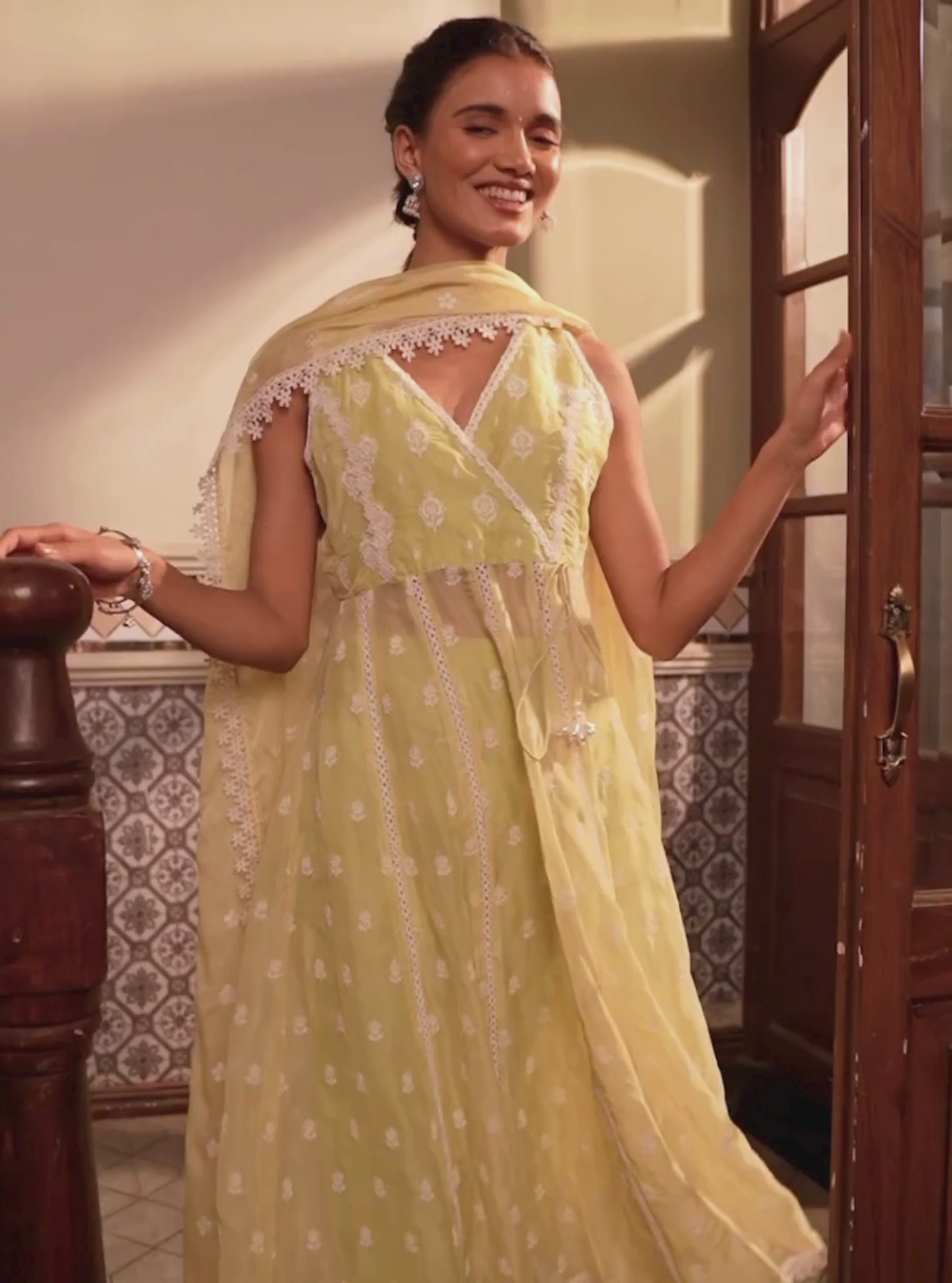 An Exquisite Angrakha-Style Sleeveless Ensemble In Delicate Lime Organza, Tailored For Your Intimate Summertime Gatherings. Versatile And Chic, This Set Seamlessly Transitions From Day To Evening Affairs With Ease. Delicate White Lace Graces The Neckline And Hemline Of The Kurta, Complemented By Intricate White Thread Embroidery Adorning The Entirety Of The Garment. The Straight Trousers Feature Delicate Lace Trimmings Along The Hemline, Adding A Touch Of Elegance To The Ensemble.