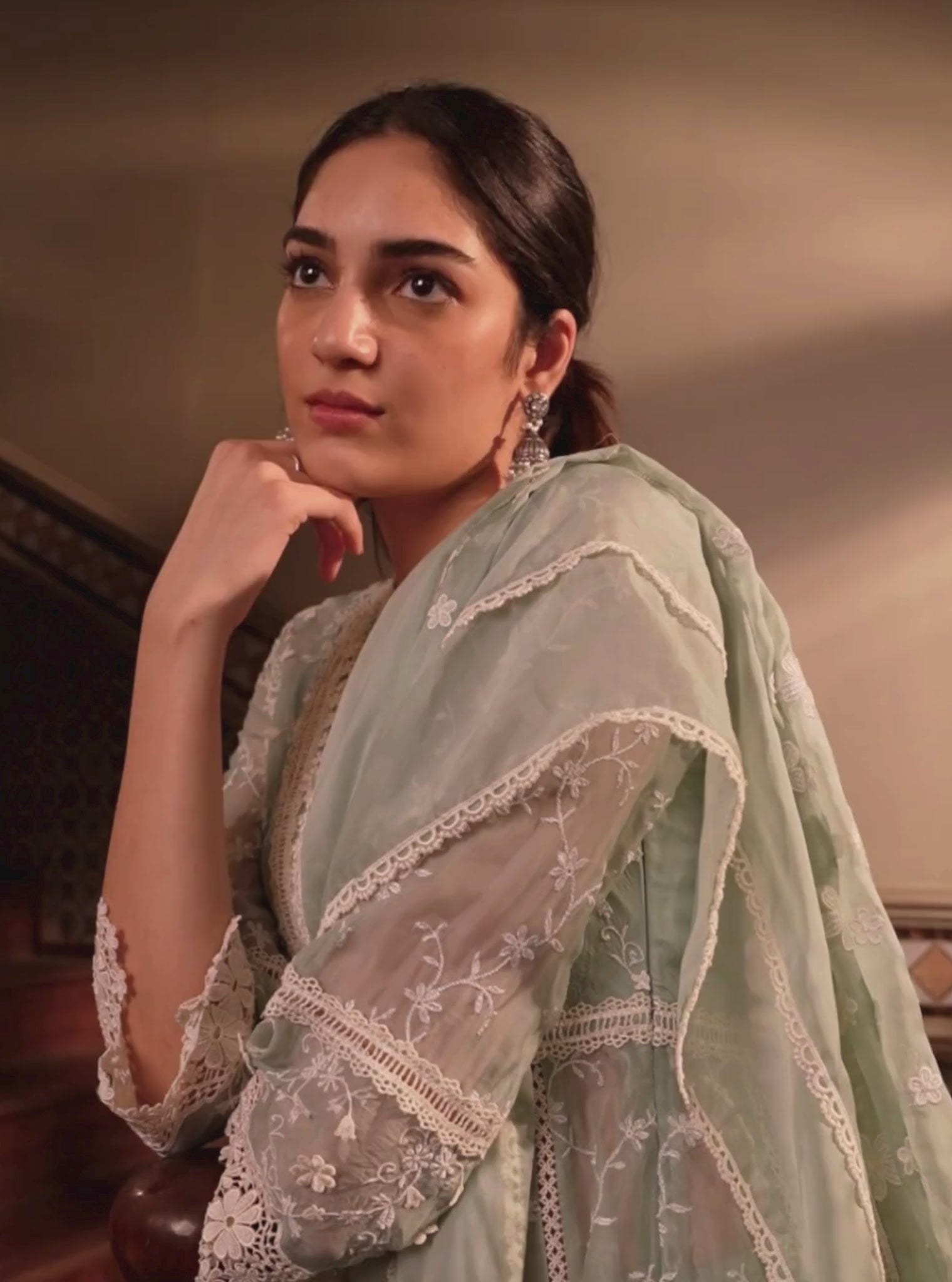 The Set Is Paired With Slightly Cropped Narrow Bottoms, Highlighted By A Broad Lace Hem, And Completed With A Matching Dupatta, Perfectly Tying The Ensemble Together.