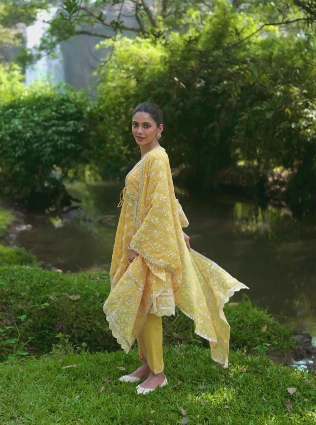 Effortlessly Elegant, This Vibrant Yellow Short Anarkali Set Is A Vision Of Grace. The Kurta, With Its Flattering Empire-Line Silhouette Adorned In Golden Embroidery, Is Designed To Accentuate Your Figure. The Tie-Up Jacket Adds A Playful Yet Polished Touch, While The Scalloped Hemline And Flared Sleeves Enhance Its Dreamy Appeal.