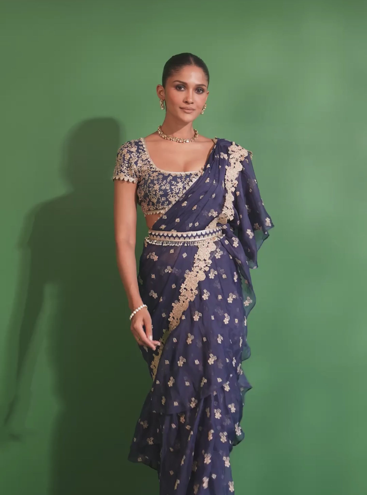 Drenched In The Mystique Of Midnight Hues, This Navy Blue Pre-Draped Ruffle Saree Is A Celebration Of Contemporary Glamour And Traditional Finesse. Embellished With Delicate Floral Embroidery In Gold Tones, The Saree Cascades With Playful Ruffle Detailing Along The Pallu, Adding A Touch Of Drama And Movement. The Pre-Draped Silhouette Offers Ease Of Wear While Maintaining The Ethereal Charm Of A Classic Saree.