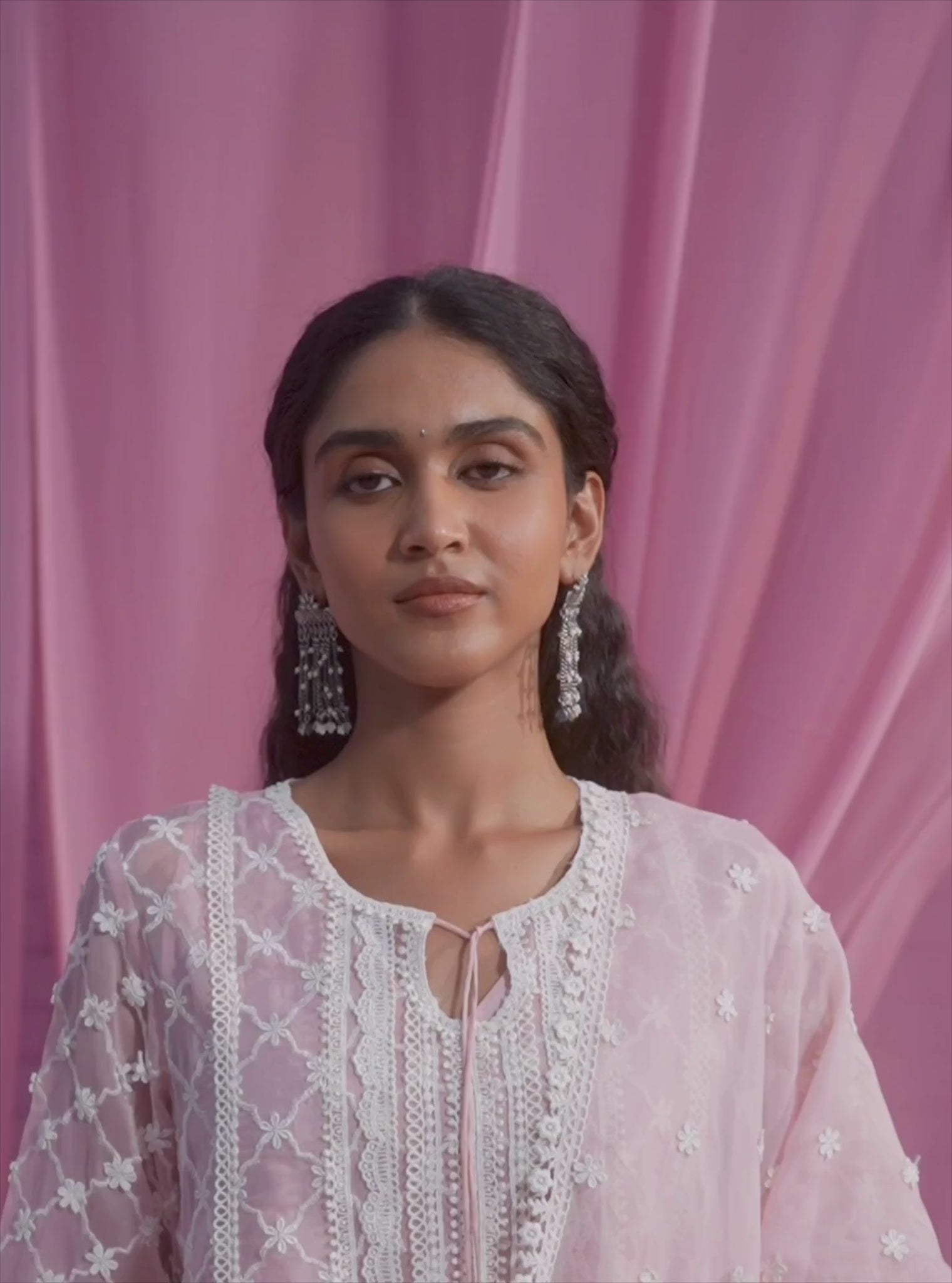 This Anarkali Set In A Delicate Shade Of Pink Is What Fairy Tales Are Made Of! The Round Neckline Of The Kurta Features A Tie-Up Detail, While The Yoke Is Adorned With Multiple Layers Of Lace. The Entirety Of The Kurta Is Covered In Jaali Embroidery In A Subtly Contrasting White Thread. The Slightly Flared Sleeves Have Multiple Layers Of Lace, While The Hemline Is Heavily Adorned With Intricate Floral Lace. Paired With The Kurta Are Straight Pants With Lace Trim At The Cuff. Finish This Dreamy Ensemble With The Matching Dupatta, Featuring A Floral Lace Border.