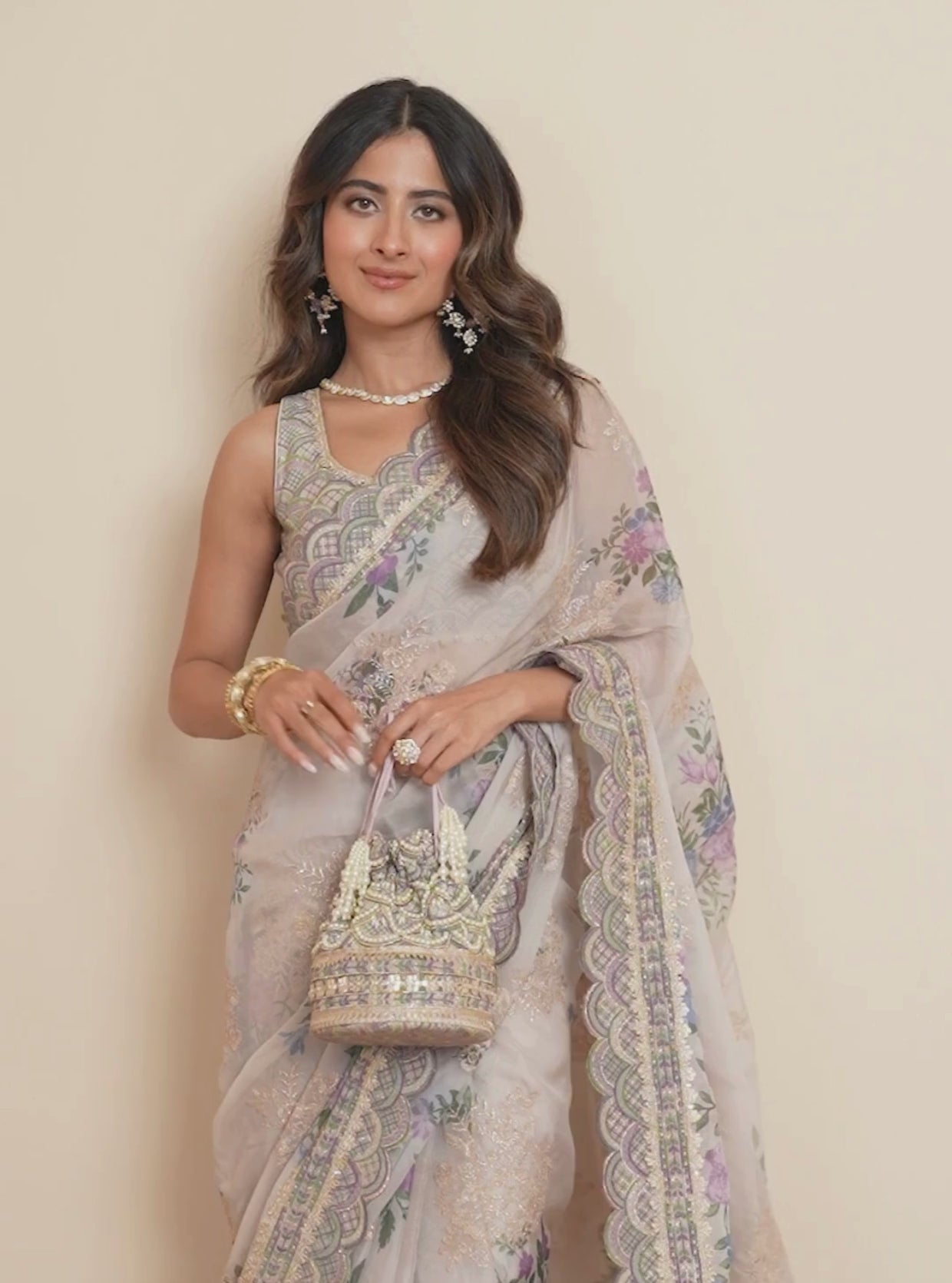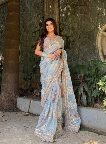 Dipped In The Richest Shade Of Ivory, This Floral Printed Saree Is A Poetic Blend Of Tradition And Grace. Accentuated With Intricate Lace Borders And Pastel-Hued Blooms, ItS The Perfect Pick For Wedding Festivities That Call For Elegance With A Hint Of Romance. The Delicate Details, Paired With Its Breezy Silhouette, Make It Ideal For Morning Pheras, Intimate Receptions, Or Even As A BridesmaidS Standout Look.