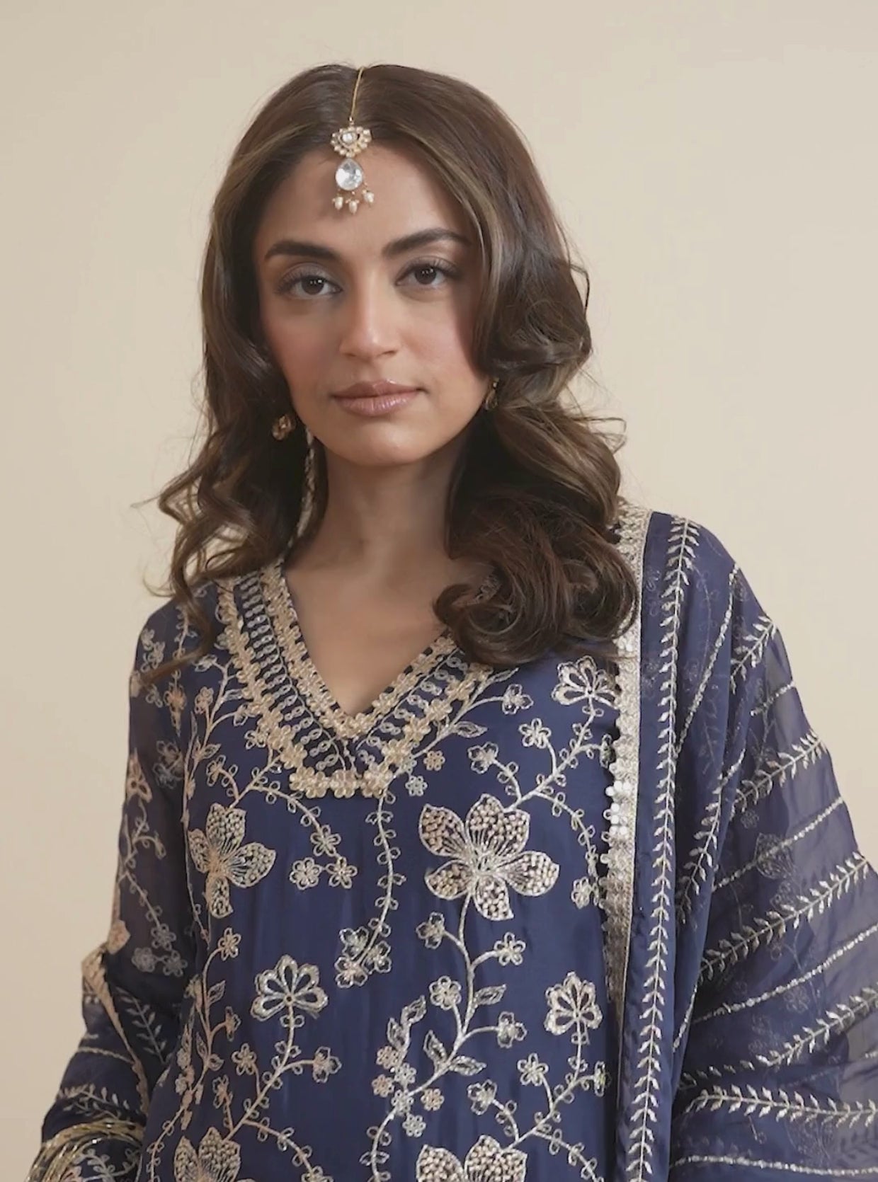 Exemplify Grace And Grandeur In This Regal Navy Blue Ensemble, Crafted To Turn Heads At Every Celebration. The Deep Blue Kurta Is A Canvas Of Intricate Golden Threadwork, Featuring Delicate Floral Motifs That Shimmer With Every Step. The Neckline And Sleeves Are Accentuated With Ornate Detailing, While The Fringed Lace Hemline Adds A Hint Of Vintage GlamourPerfect For A Mehendi Evening Or A Festive Dinner.