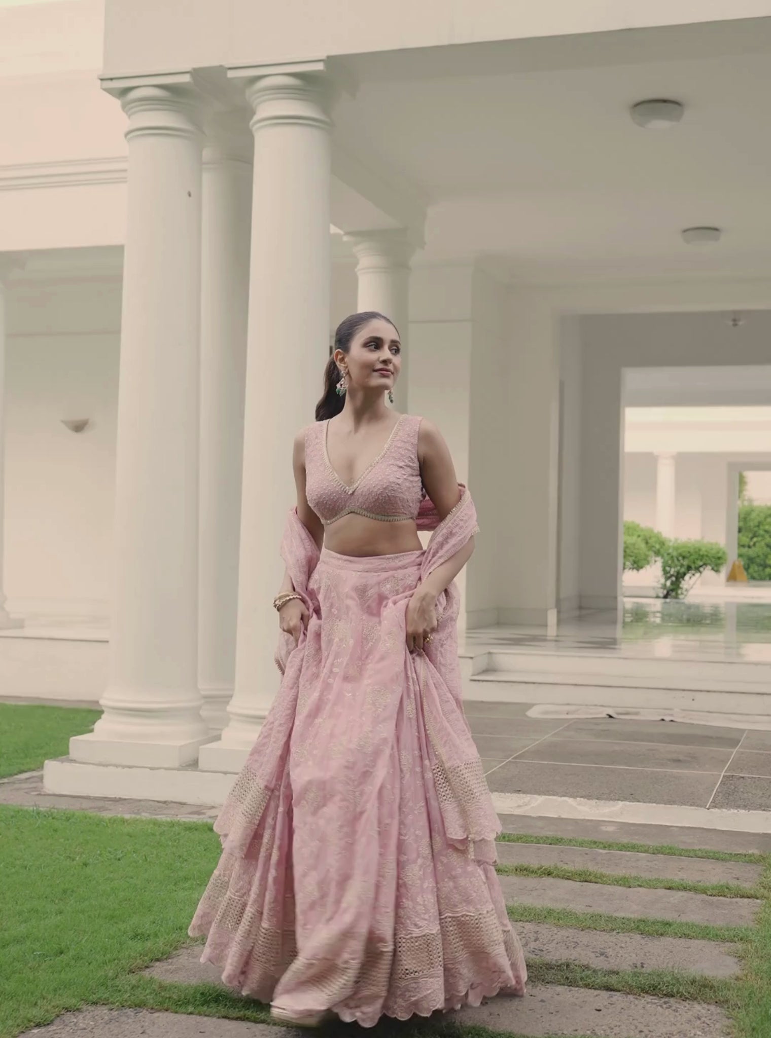 Soft And Sophisticated, This Onion Pink Lehenga Is A Vision Of Understated ElegancePerfect For The Modern Bride Or Bridesmaid. Crafted In Airy Organza With A Lustrous Pima Satin Blouse, The Ensemble Is Adorned With Subtle Detailing That Speaks Of Quiet Luxury. The Matching Organza Dupatta, Edged With Delicate Borders, Adds A Graceful Finish, While The Flowing Silhouette Exudes Timeless Charm. Ideal For Pastel-Themed Celebrations, Daytime Weddings, Or Intimate Festive Gatherings, This Lehenga Celebrates Beauty In Its Most Refined Form.
