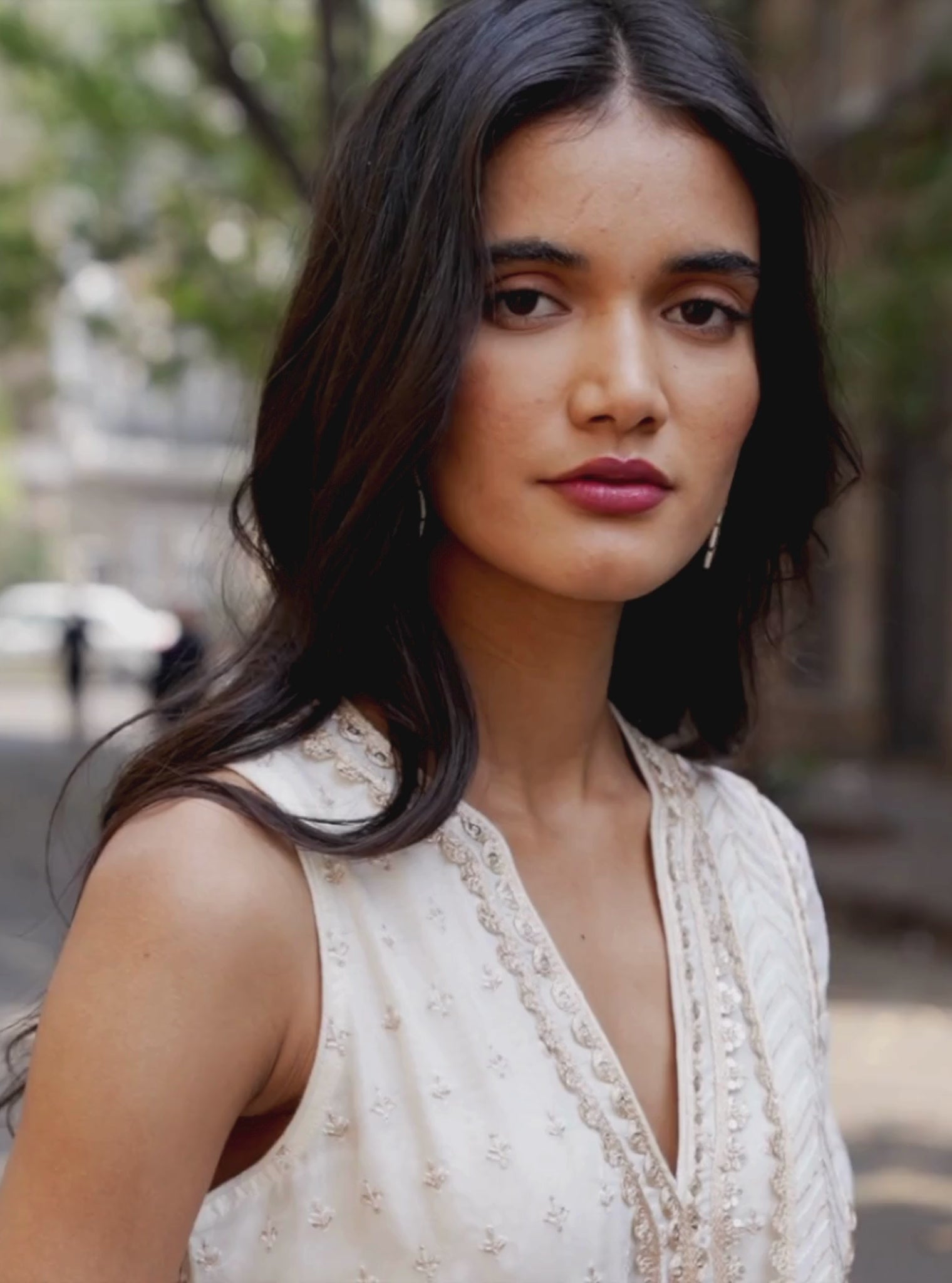 A Youthful And Playful Ensemble, This Sleeveless Short Kurta Paired With Flowy Gararas Exudes Charm And Elegance. Perfect For Summer Festivities, The Breezy Silhouette Offers A Refreshing Appeal. The Kurta Boasts A Long V-Neckline Embellished With Sequin Gotas, While Sparse Booty Embroidery Delicately Adorns Both The Kurta And Gararas. The Gararas Themselves Steal The Spotlight With Layers Of Gota In The Lower Half, Lending An Understated Regal Touch To The Attire.